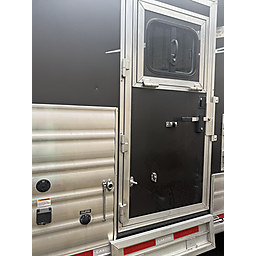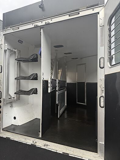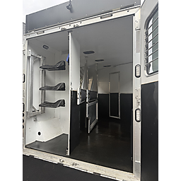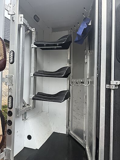 -Spacious rear side tack with swing out saddle racks. Brush trays on rear tack door. Hooks for headstalls.