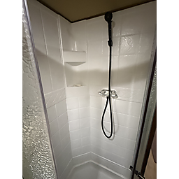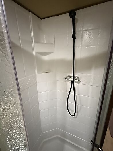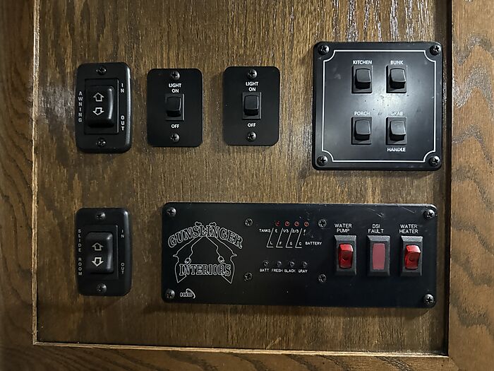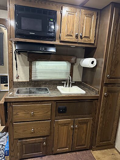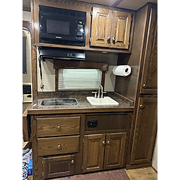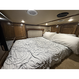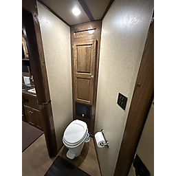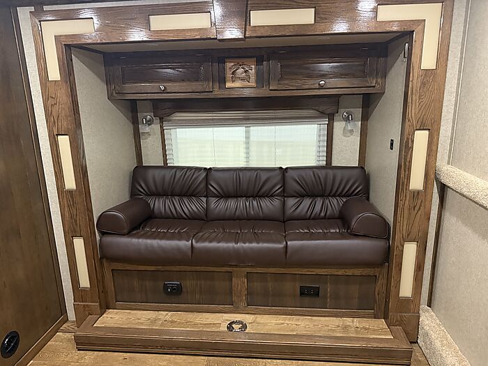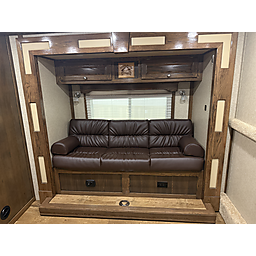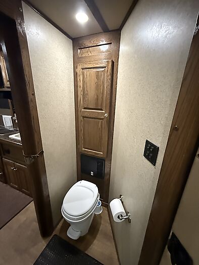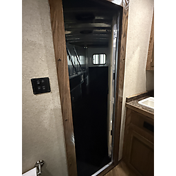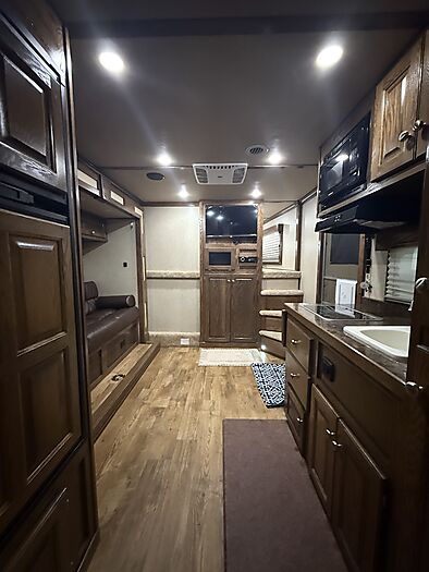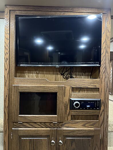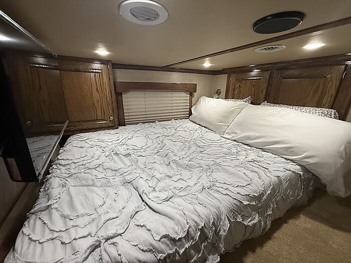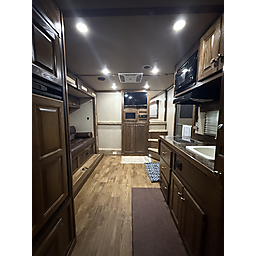 Recessed lighting in living quarters. Sleeping area with flat screen TV. Wood cabinets throughout with customer panel on fridge. Leatherette could in slide out. PLenty of storage. Full bathroom with shower stall.
