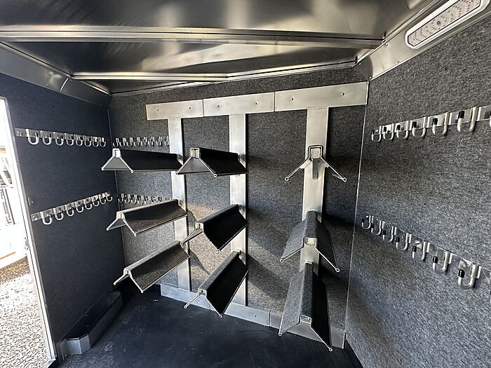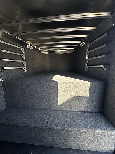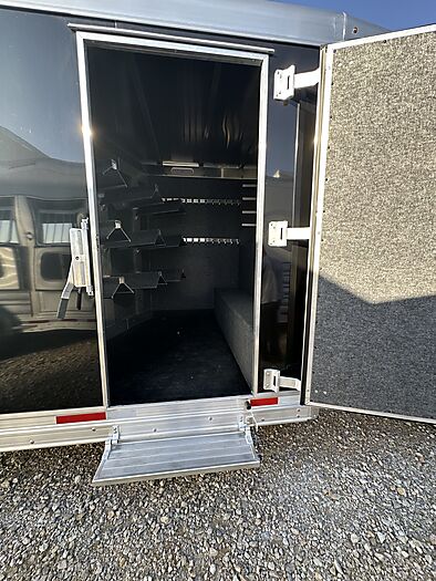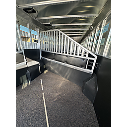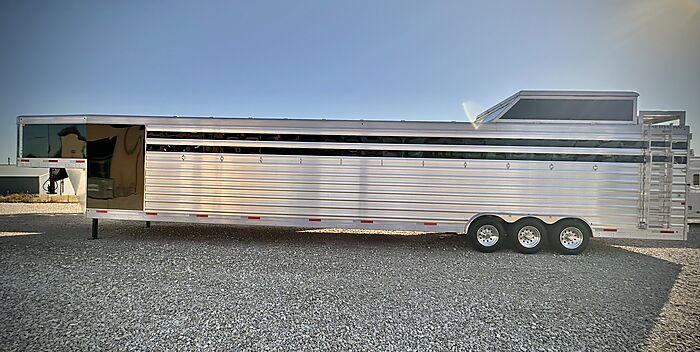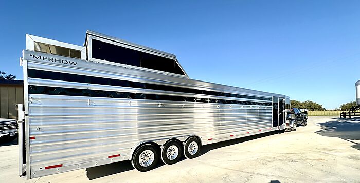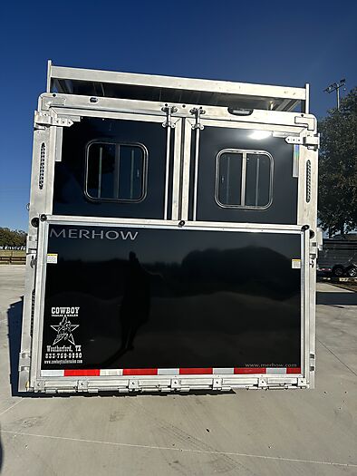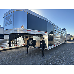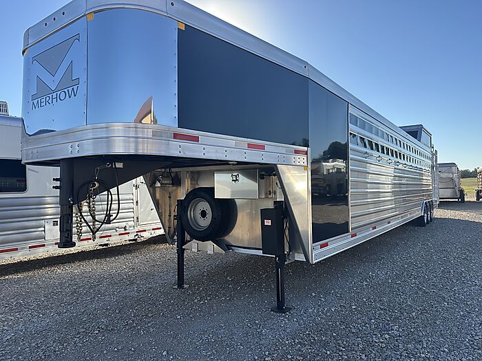 12 Horse Merhow - Cutter series = 44 Long (floor) x 8 Wide x 7 Tall, 8k axles, Electric/Hydraulic brakes, ST215/75R17.5 tires, Aluminum wheels, Spare tire, Dual leg hydraulic jack, Aluminum battery box, Stainless steel nose, Plexiglass and track on both head and hip sides, Hay pod with walkway, Full rear ramp, 50/50 doors, Cobalt poured floor, Padded dividers, 11 - 36" stalls and the last is 76", Hanging mats on all dividers, 12 two-way roof vents, 5 LED lights in stalls, 5 LED lights in tack room, Carpet on walls in tack room, 9 Saddle racks, 48 Bridle hooks, 2 Swinging pad racks, Full boot box with split lid, Fold down step at tack room door, LED load lights, LED lights, 4 LED tail lights. Merhow 8-year structural warranty!
