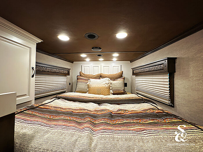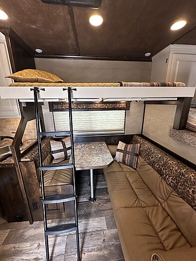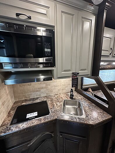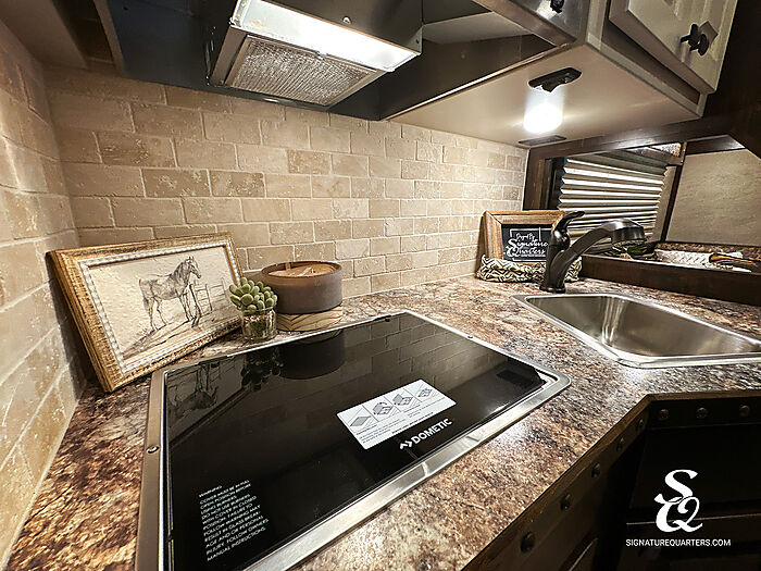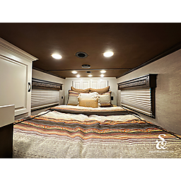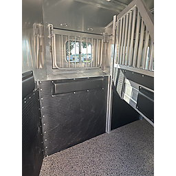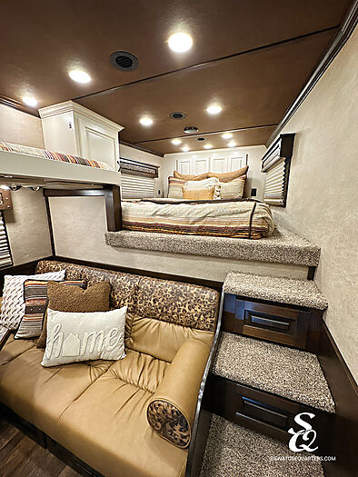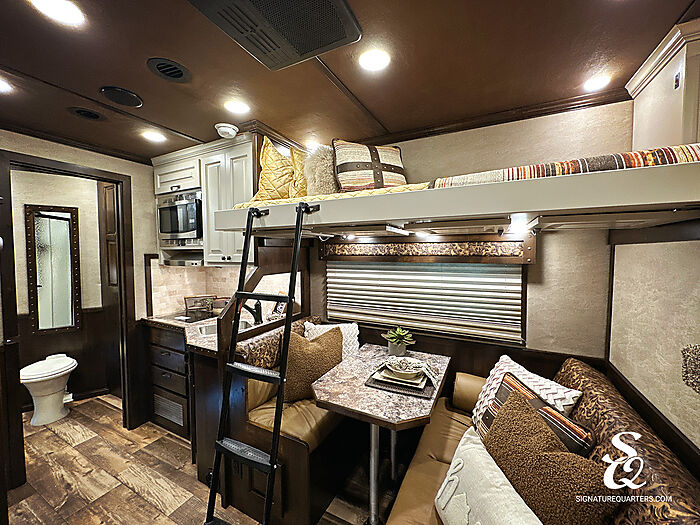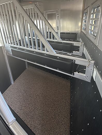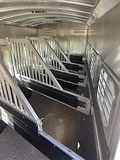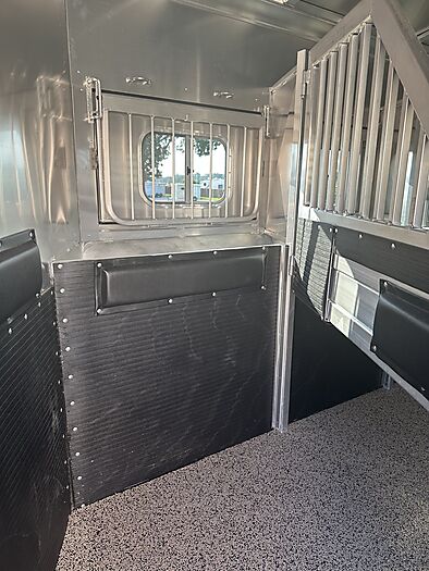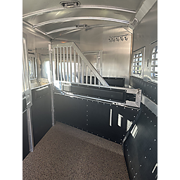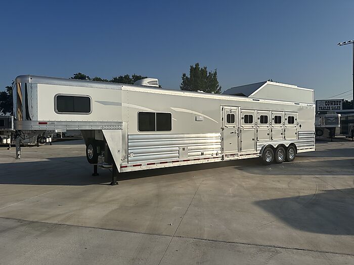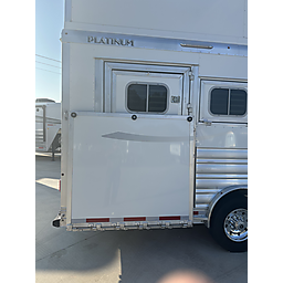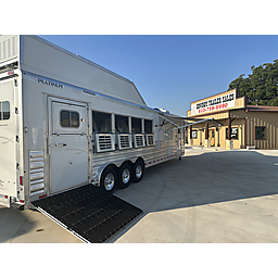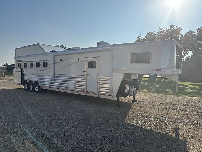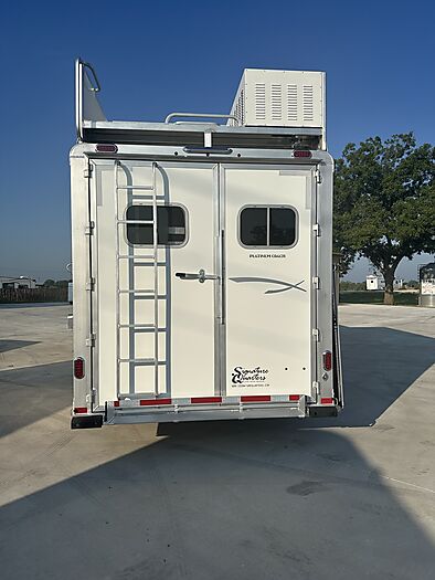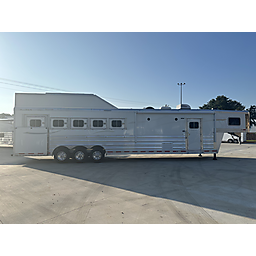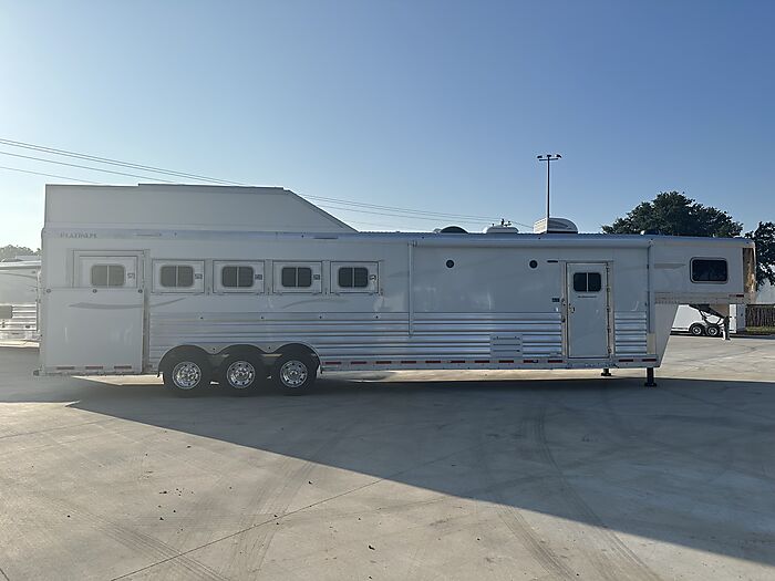 2025 Platinum 5 horse with a 13' short wall - Signature Quarters interior = 36' Floor x 8' Wide x 8' Tall, 3 - 8k rubber torsion axles, 17.5" tires on Alcoa aluminum wheels, Spare tire, Electric brakes, Dual leg hydraulic jack, Aluminum battery box, Overmount intergrated 8' Hay pod with roof rack, 4000 Onan Generator, Drop down windows on the head and hips, Mangers, Side load, Rubber lined walls, EquiFlex floor, Stud divider on first stall, 10 Bridle hooks on first stall, Escape door, All padded flow-thru dividers, 4 - 40" wide stalls and one 48", Full rear tack, 6 saddle racks, 3 corner shelves, One long shelf, 2 Brush trays, 6 blanket bars, 2 pair splint boot holders, 20 Bridle hooks, 13' short wall with Signature Quarters interior, Sleeper sofa, Half dinette, Fold down bunk (can easily be converted to cabinets only), 6.0 Refrigerator, Lots of closet space, Walk thru door, Convection micowave, Cooktop, TV, Stereo, Awning, Many more extras. Stock # 12946