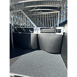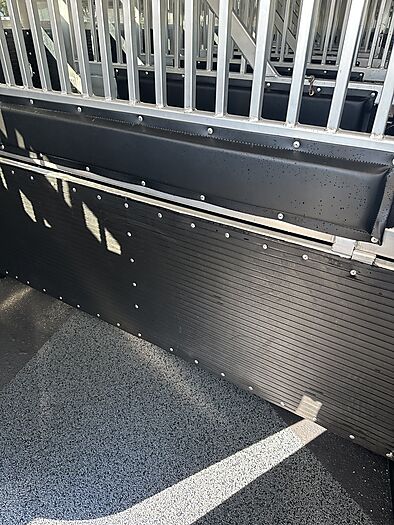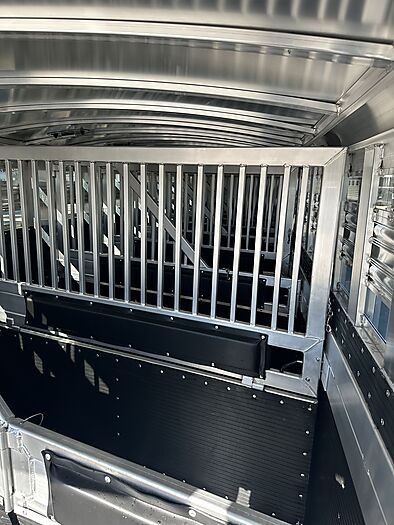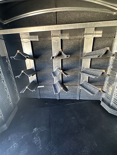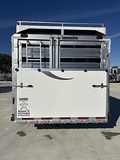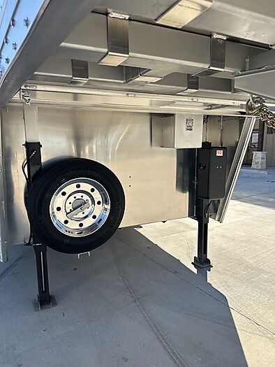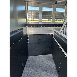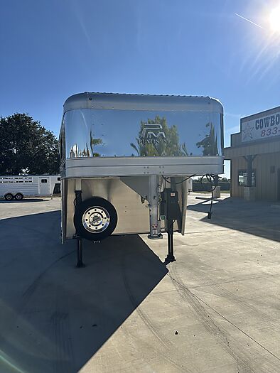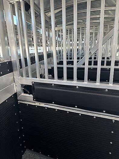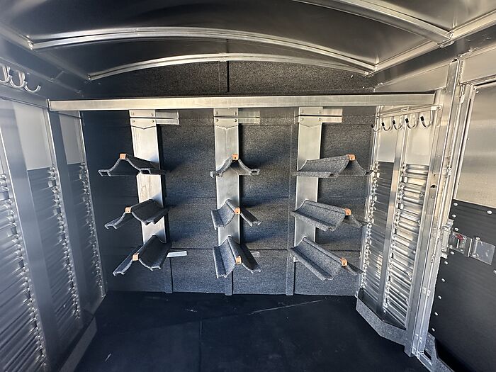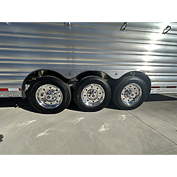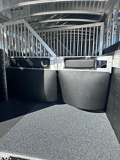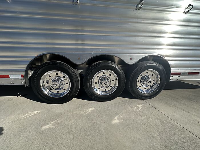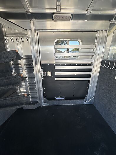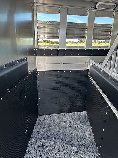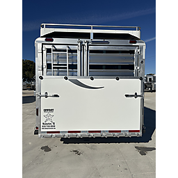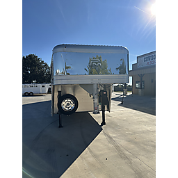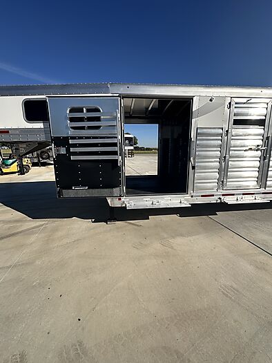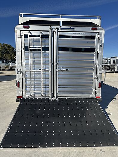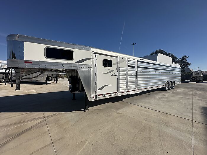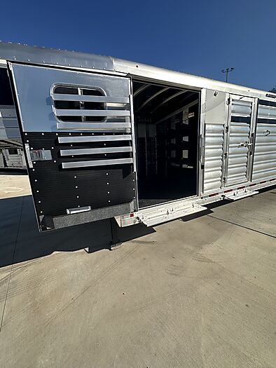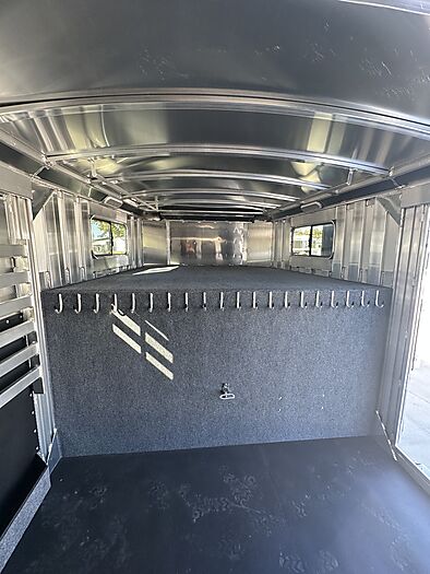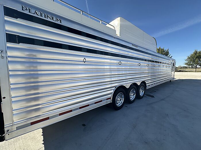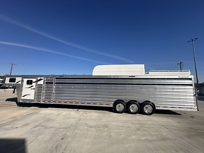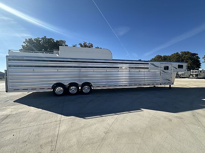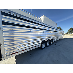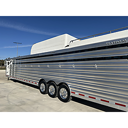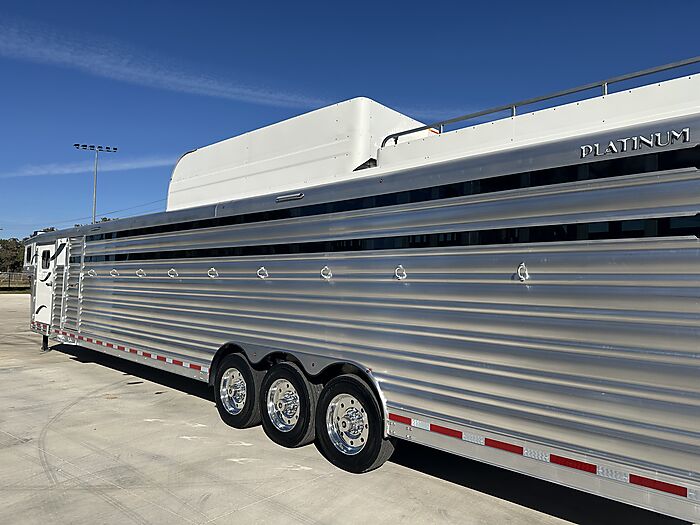 2026 Platinum 10 Horse Trainer Trailer = 42' Long X 8'6" Wide X 7' Tall, 8k rubber torsion axles, Electric brakes, 245/70R19.5 Continental tires, Alcoa aluminum wheels, Spare tire, Dual leg hydraulic jack, Aluminum battery box, Stainless steel nose, 10' hayrack with 106" platform, Spring loaded full rear ramp, 40/60 double rear gates, EquiFlex floor with paw strip, Plexiglass and track with storage under G/N, 5 stud dividers with removable baby panels, 4 dividers with hanging mats, 4 - 39" stalls, 5 - 40" stalls and one 64". Rubber lined on all walls, Escape door, 5 long ouside LED lights, 5 LED lights in horse compartment, 84" short wall on tack room, 2 - 48" doors on each side, 9 extra wide saddle racks, 6 blanket bars on each door, 4 brush trays, 30 bridle hooks, 2 clothes rods in gooseneck, Carpet on walls in tack room, 4 LED lights in tack room, 20 inside tie rings, 10 tie rings on each side - outside, 10 two-way roof vents.