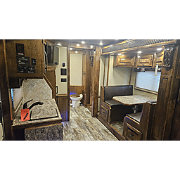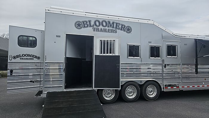 Brand new 2026 Bloomer 5 horse LQ with Outlaw conversion, full rear tack, escape door on butt side, ramp, stud wall, mangers, drop doors on head and tail with shocks on feed doors, 8 wide, 8 tall, Integrated haypod, 3 8k lb axle with disc brakes, electric over hydraulic, 19.5in Alcoa wheels, 15'10sw, 1 9ft slide with 72in dinette, awning, leather accented ceiling in LQ, tin accented ceiling in bathroom, additional generator switch in sleeping area, couch on drop wall, double rod closet in bathroom, large bathroom area with corner shower and bench seating, 2 smart tvs with Wynguard antenna.