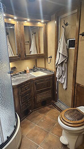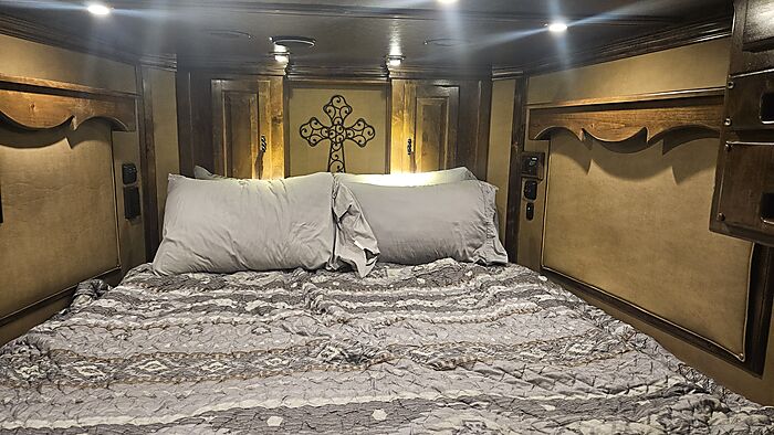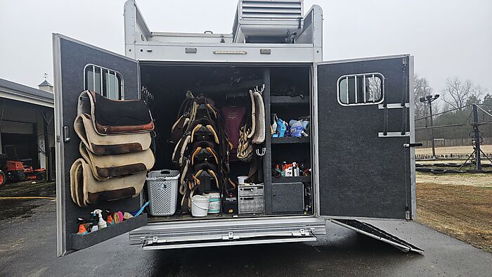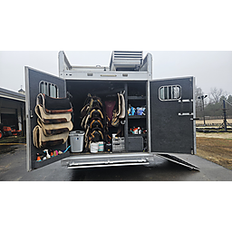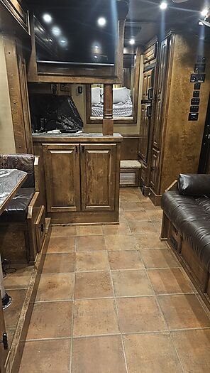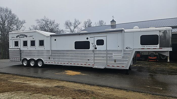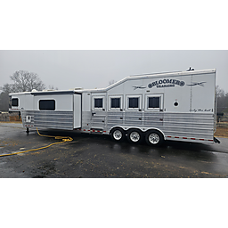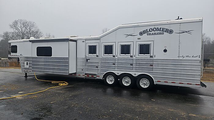 2018 Bloomer 4 Horse LQ PC Load with Outlaw Conversion, mangers, drop doors on head and tail, escape door, stud wall, Ramp, 3 8lb axles, Werm Flooring, 17.5in Alcoa wheels, Electric over Hydraulic brakes, Hydraulic jacks, Full Rear Tack, 1 slide, integrated hay pod, gas generator with 1700hrs, 2 A/C units, 17'10sw, U shaped dinette in slide, huge bathroom, large closet in bathroom, pass thru door, 2 tvs and satilite.