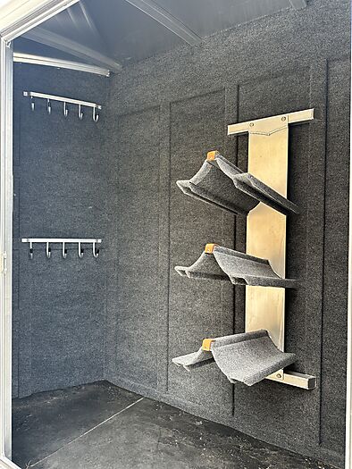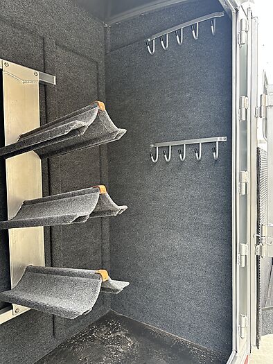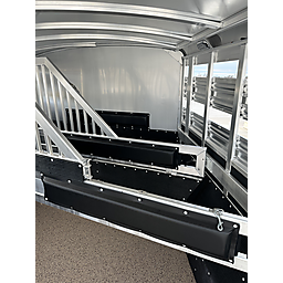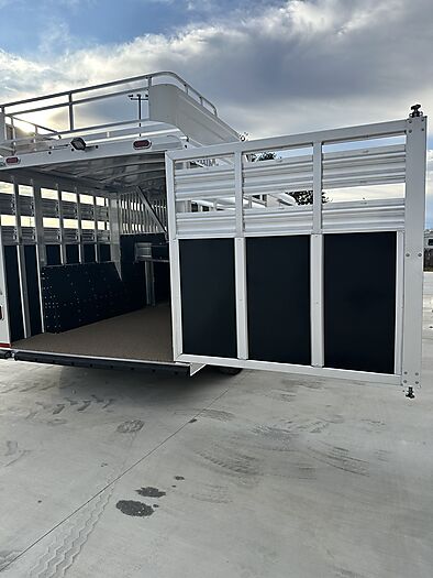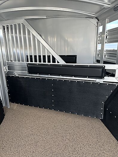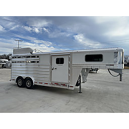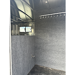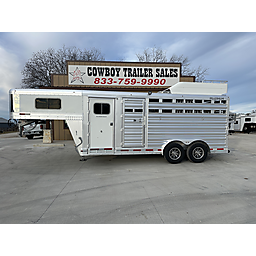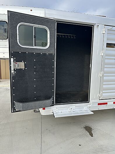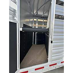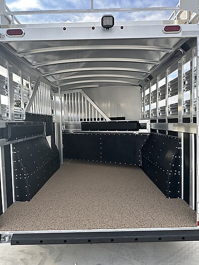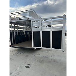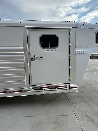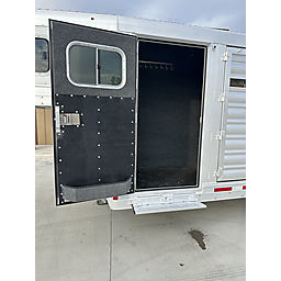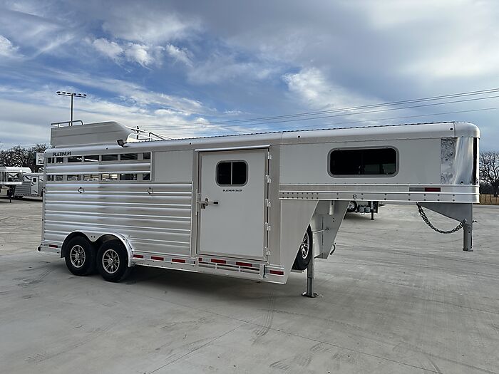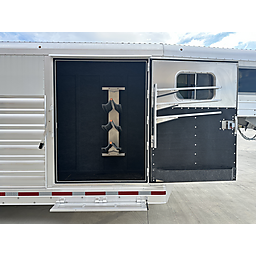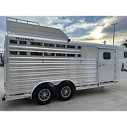 2026 Platinum 3 Horse Stock Combo - Split tack # 13260 = 18' Floor x 8' Wide x 7' Tall, 5200# Rubber torsion axles, Electric brakes, ST235/85R16 14 ply tires, Aluminum wheels, Spare tire, Aluminum battery box with battery kit and wiring, Stainless steel nose, LED Lights, 3 Exterior LED lights, 4 Interior LED lights, Full rear door, EquiFlex floor, Glued 48" rubber mats on walls, Removable baby panel on first divider, Escape door, Split tack has a 48" short wall, Carpet on all tack room walls, 32.5" Dressing room door on head side, 48" Door on hip side, Flip down flow-thru steps on each door, 3 Extra wide covered saddle racks, 3 Swing out blanket bars on door, 30 Bridle hooks, Clothes bar, 2 Brush trays, 3 Shelves, 6' Hayrack with ladder.
