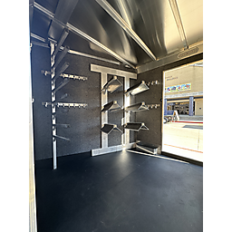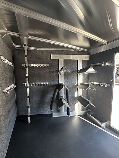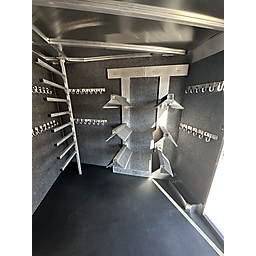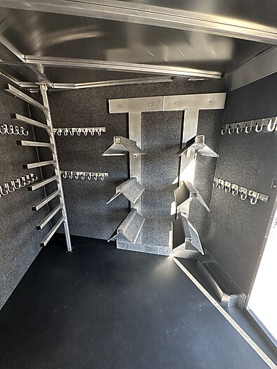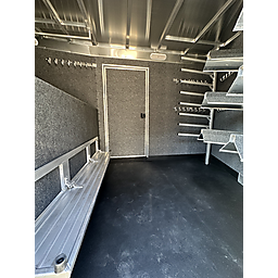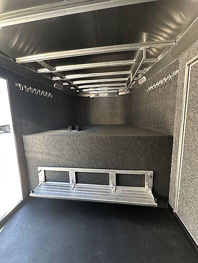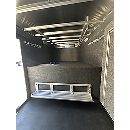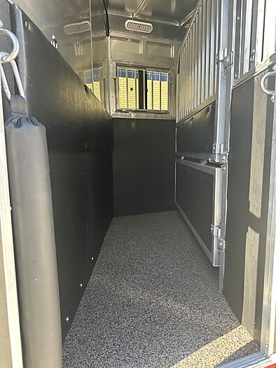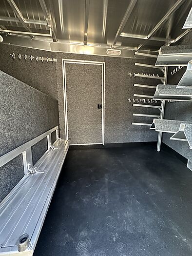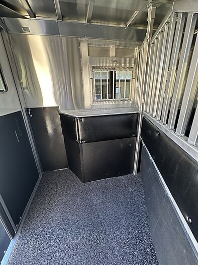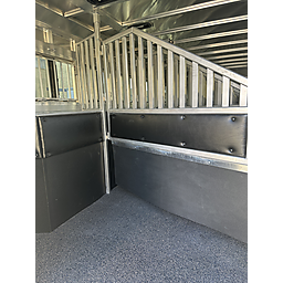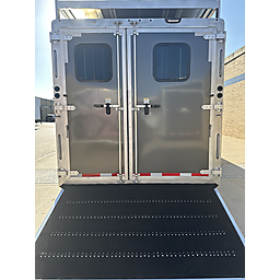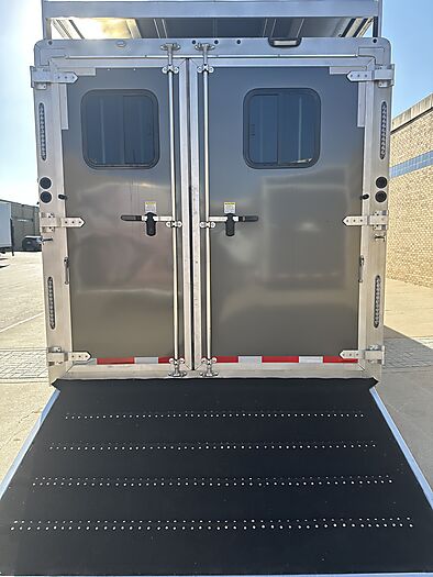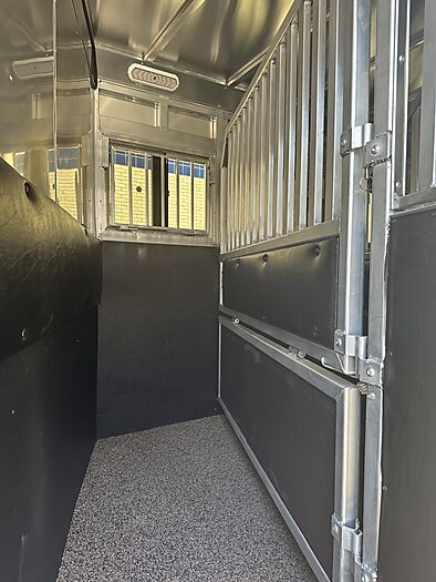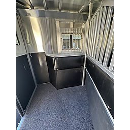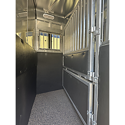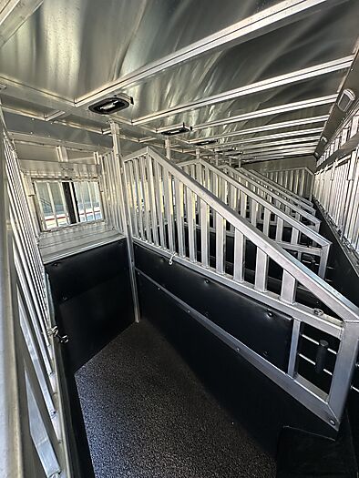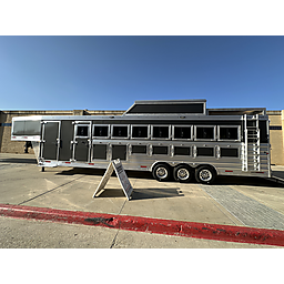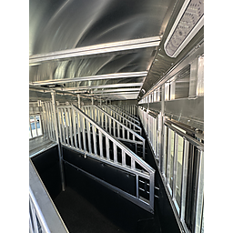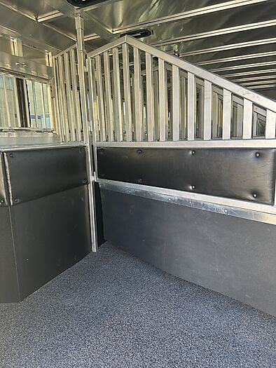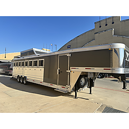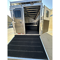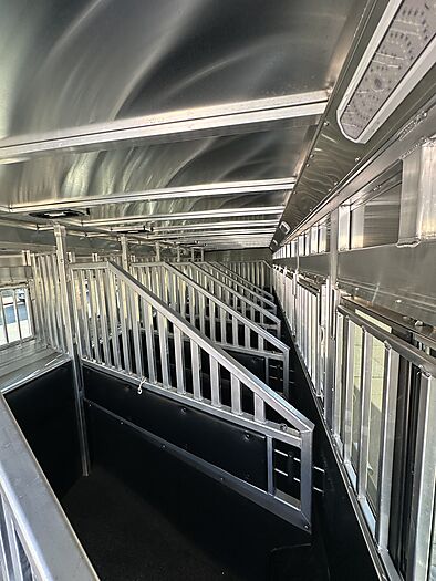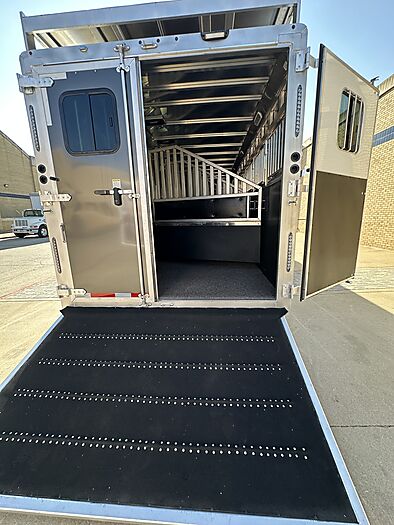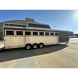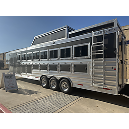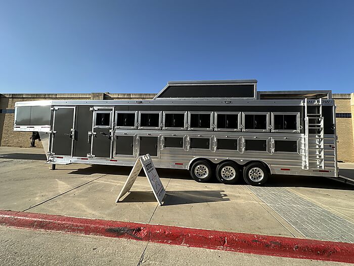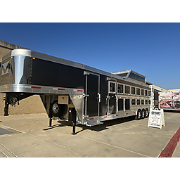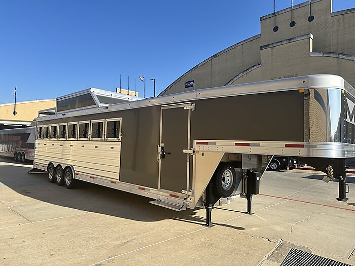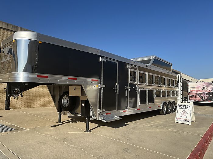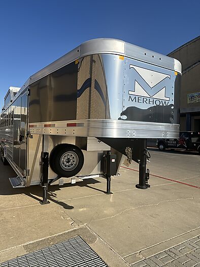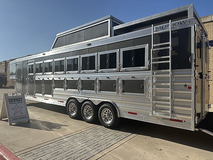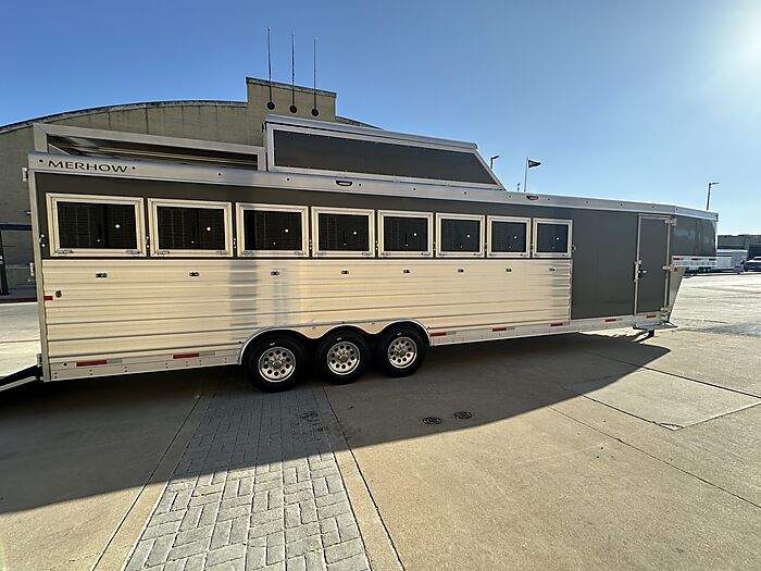 2026 8H Merhow Cowboy Cutter Series trainer trailer = 34' Floor x 8' Wide x 7'6" Tall, Triple - 8k rubber torsion axles, Electric brakes, 17.5" 16 ply Cooper tires, Aluminum wheels, Dual leg hydraulic jack, Aluminum battery box, 10' Hay pod with extended deck, Pull out ladder, Drop down windows on both the head and hip side, 7 Mangers, 18" Mangers, Escape door, Stud divider on first stall, Padded air-flow dividers with hanging mats, Cobalt poured floor, 60/40 rear doors, Full rear ramp with cleats, Tack room doors on both curb and street side, Flip down steps at both tack room doors and escape door, 6 Heavy duty saddle racks, 8 Blanket bars, 30+ Bridle hooks, Carpeted walls in tack room, Flip-down bench seat, Brush tray, Clothes rod, High intensity LED lights in horse compartment and tack room, LED tail lights, LED load lights, Medium charcoal skin color.