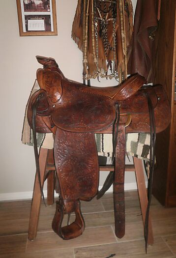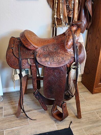 Completely Floral Hand Tooled, 15 ½ in. ¾ Inlaid Padded Seat, Double Rigged, Visalia Stirrups.