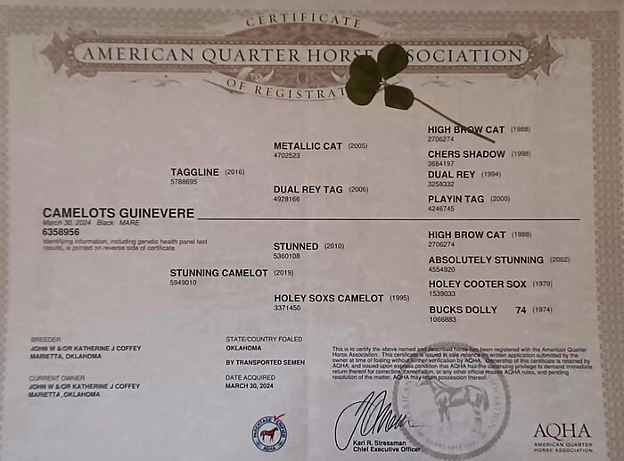 Outstanding black filly by Taggline. 6 panel N/N. NCHA Super Stakes nominated - Ritata Buckle nominated. She is also eligible for the Abilene Spectacular Incentive. This filly moves like a ballerina with solid bone structure and really good feet.