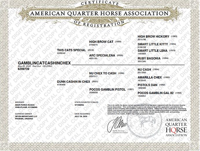 This colt is bred to perform with a pedigree packed full of talent. His sire is This Cats Special, a proven NCHA money-earning son of the legendary High Brow Cat (LTE $126,252, PE $90 million and #1 NCHA Sire of all time), known for producing top-notch cutting and cow horses. His dam is an own daughter of the great Nu Chex To Cash (LTE $60,000, PE $4 million), a multiple world champion and renowned reining horse sire. He's even a great grandson of the NCHA Triple Crown Champion Smart Little Lena (LTE $743,275, PE $42.3 million and #2 NCHA Sire of all time!)
