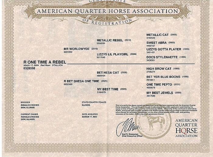 2024 Red Roan stud colt. 5 Panel N/N GBED N/G sired by "Mr Worldwyde" a son of Metallic Rebel Earner of $438,315 NCHA World Champion & NCHA Horse of The Year out of a daughter of Bet Hesa Cat who is out of a daughter of One Time Pepto. Located north of St Louis 35 mile in Illinois.