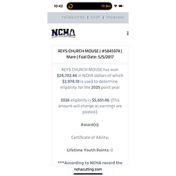 Rosie is suitable for non-pro or amateur riders. She is a two time WOW 50k Am finalist, She has excelled at the club shows, winning back to back year end saddles in the 5NNP. She is fully novice eligible for 2025. Last shown in Vegas in the WOW 50k Am.