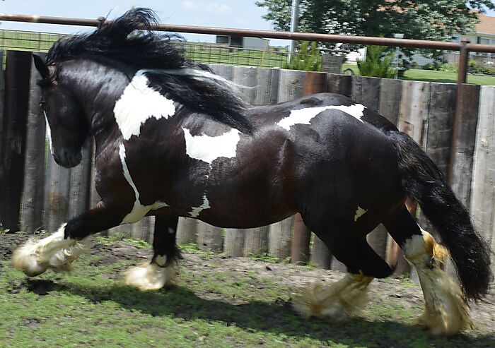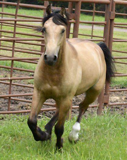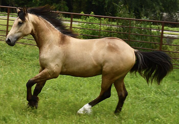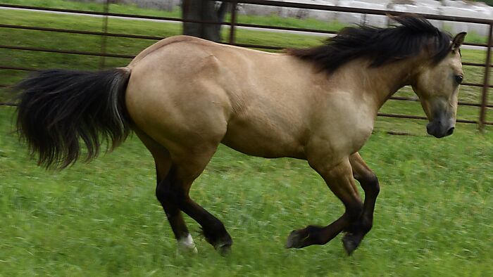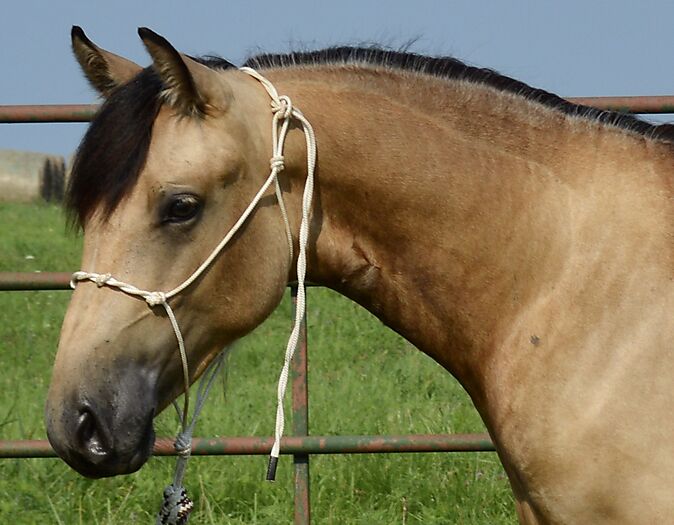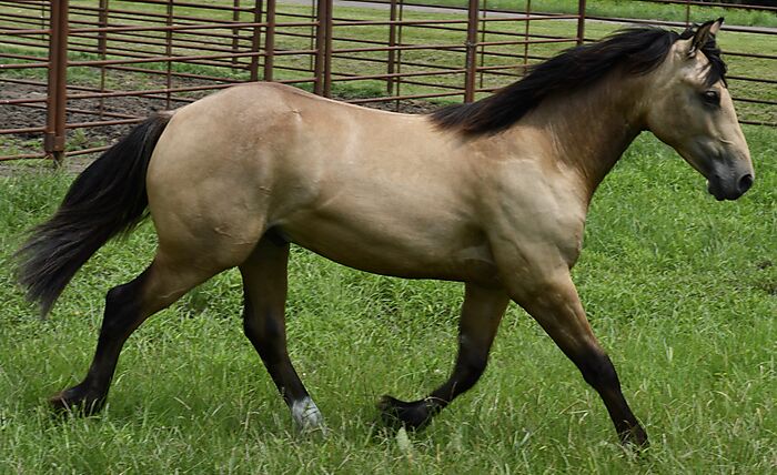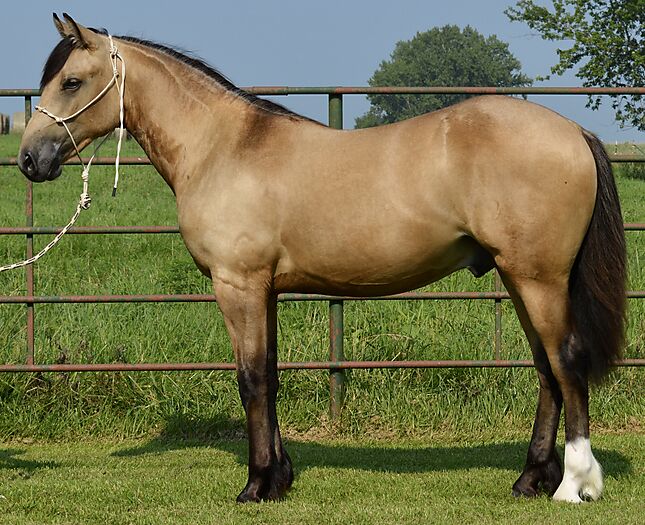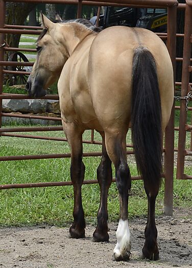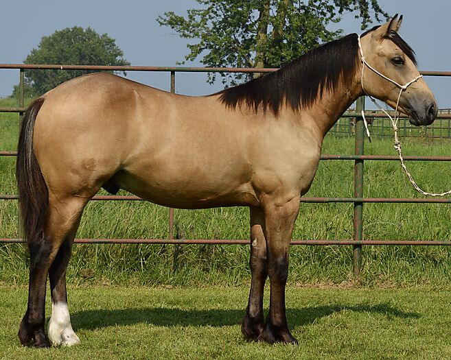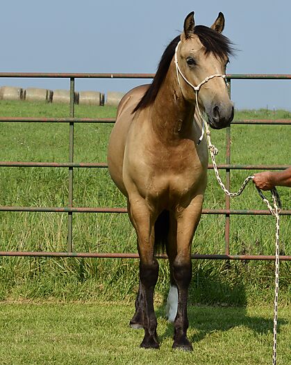 Buck by our registered Gypsy Vanner Stallion, Boomer (Stallions page). Bucks Dam (Mares page) is an own daughter of AQHA point earner in Heading, Heeling, Tie Down roping and Halter - Sizzle Eyed. (Two Eyed Red Buck x Rhinestone Jack). Big stout great colored colt. Super gentle and easy to get along with. Fluid mover. He will sure ride around. He is sure an athlete. He will get you there and do the job when you get there. For you Gunsmoke fans, one of Matt Dillions Buckskin horses was a draft cross, with a thin white strip, a left hind sock, and his name was Buck.PorterQuarterHorses com