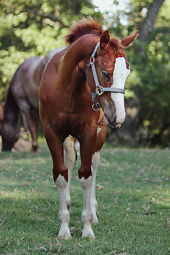 Incredible performance/stallion prospect available. Ares is chromed out with a big blaze, 4 white stockings, and rabicano. He is AQHA registered, and is also eligible for APHA registration. Born 3/15/25