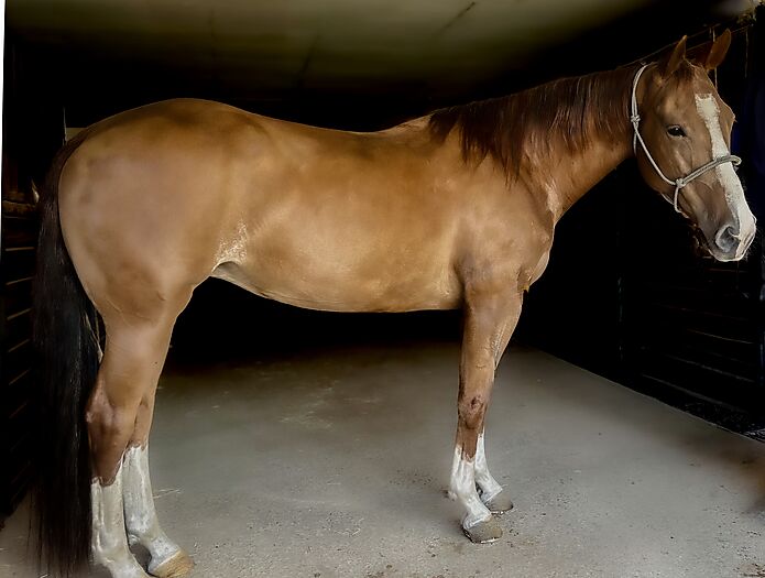 She has been off since May 2024 due to left hind suspensory injury, moving around well now and could be ridden, primarily being sold as a broodmare. Vet checks are welcome.