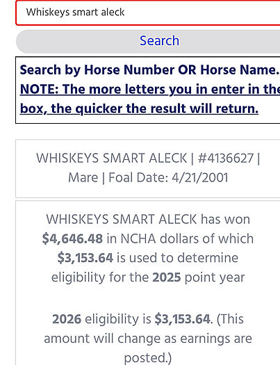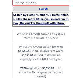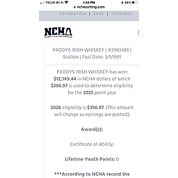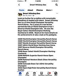 Ohio’s dam Whiskeys Smart Aleck has $4,646. In NCHA earnings and her certificate of Ability and she is also a 3/4 sister to the legendary SMART WHISKEY DOC who is a 2 time World VRH and 1 Reserve World AQHA VRH as well as AQHA World Ch Cow Horse - see his extensive show record in the photos.