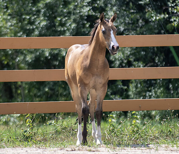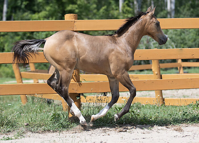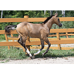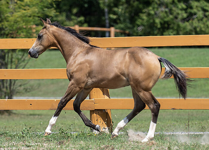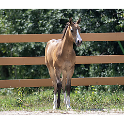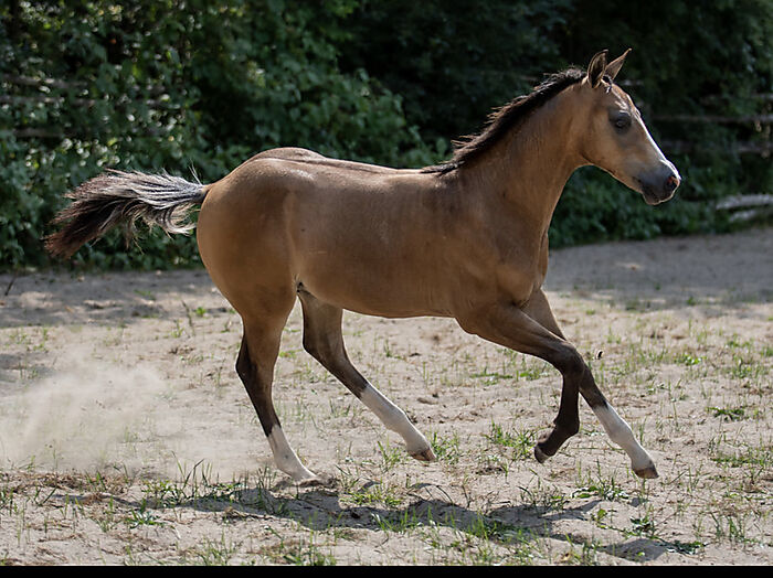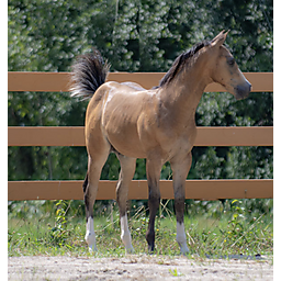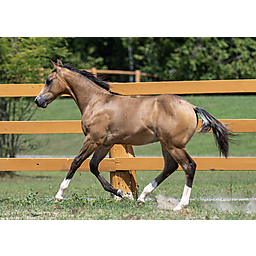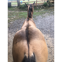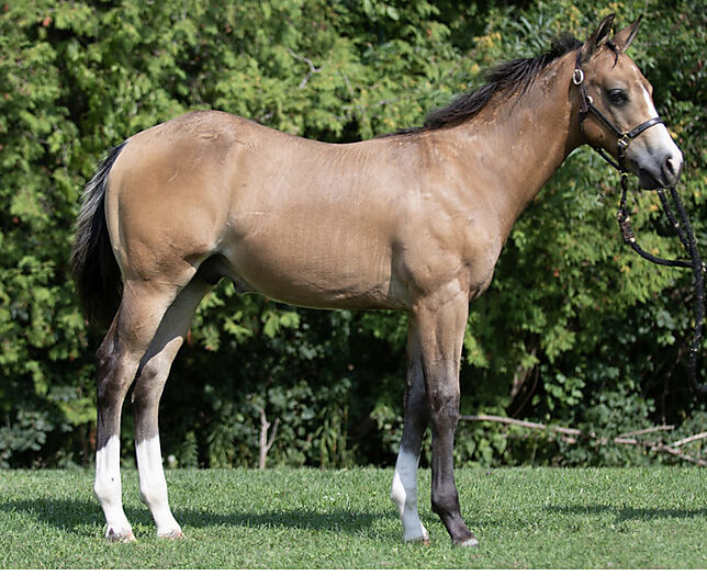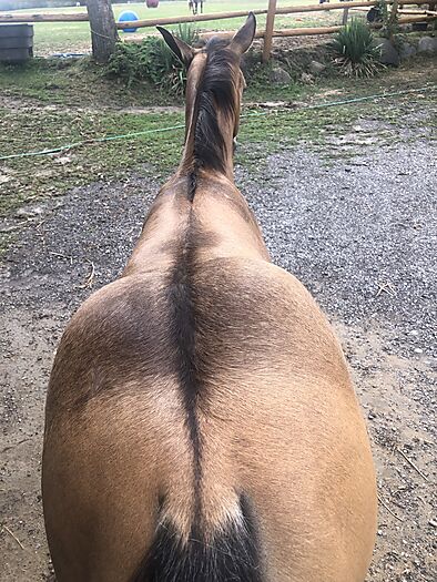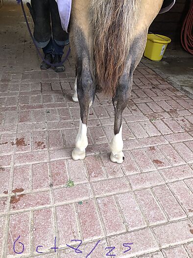 Streaker also has a dorsal stripe, shoulder shadowing and bars behind his knees and although cannot be a Dun- he carries all the markings of one.