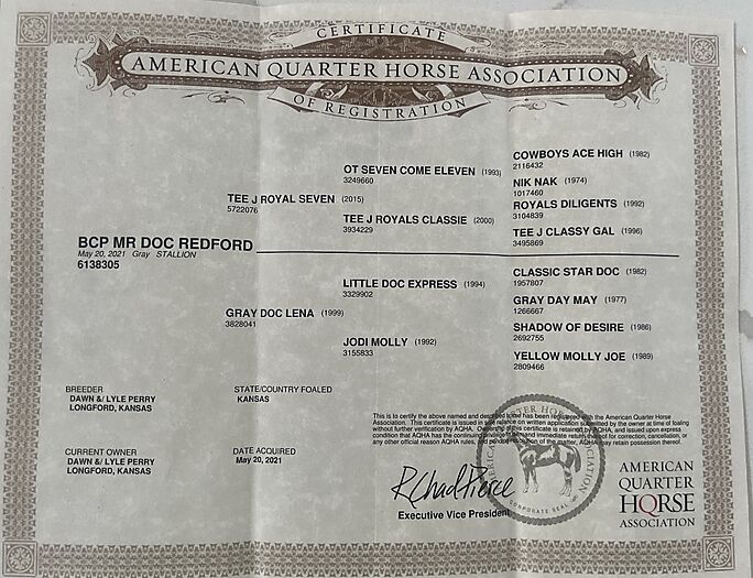 A big gorgeous gray, BCP MR DOC REDFORD aka "Jerry" is a 2021 AQHA son of Tee J Royal Seven, with the bottom side going back to Little Doc Express and Classic Star Doc. His pedigree gives him the size, confirmation, athleticism and the mind to go in absolutely any direction you desire. Start him on barrels, start him in the roping box and/or use him on the ranch! Jerry stands a solid 15.1-2 hands and is put together the way you want one Balanced and with plenty of bone. He's broke and is ready for a job. The perfect prospect to go any direction.