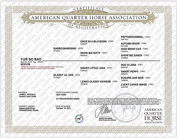 Yur So Bad is a 2023 Bay Rabicano Mare by Badboonarising x Classy Lil Sas (Smart Little Lena). She stands 14.2 hands and has been in cow horse training with Daniel Sanchez for 10 months. This filly is strong, cowy, and is on track for the 2026 futurities. Dual registered AQHA & APHA and 6 Panel N/N.