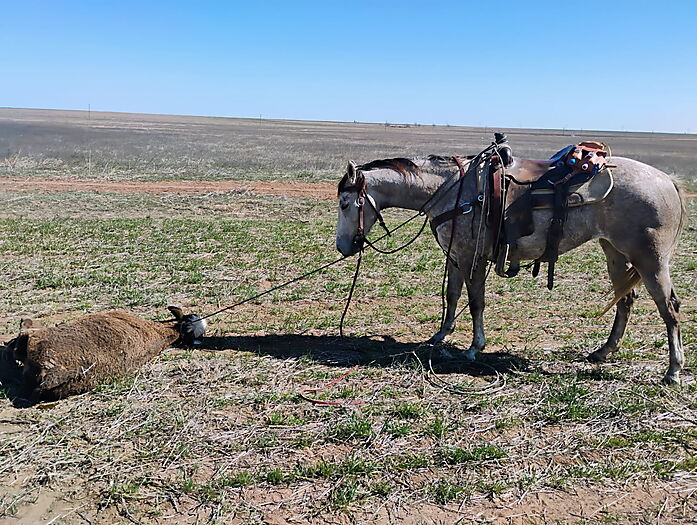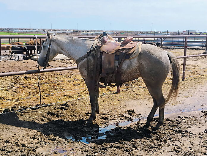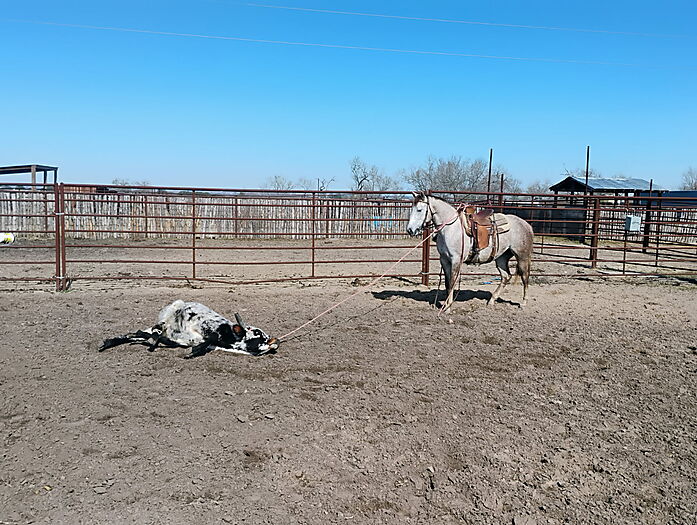 We bred and raised "Juanita". She has been in consistent training with us since she turned 2. Juanita has been working on a backgrounding yard since March 2025. She has doctored many yearling on wheat by herself. This tough, gritty mare will go all day. This is Gus's favorite to ride in mud or snow. She keeps her feet under her and hasn't missed a step. Juanita has a lot of talent and would easily make a rope horse. Stands 14.2 hands tall. Not a beginner horse. 6 panel tested n/gbed other 5 n/n. Priced at $15,000