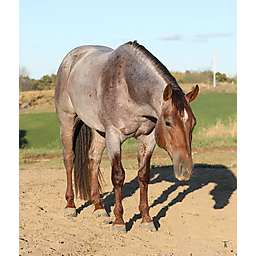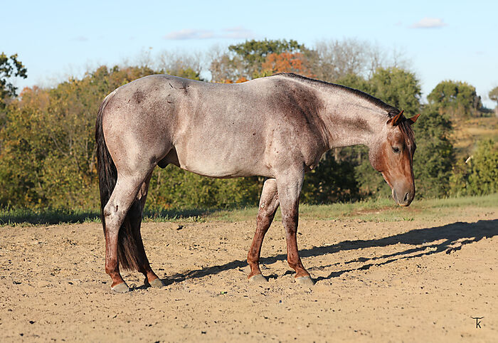 Outstanding 2 year old red roan stallion by 2X AQHA World Champion Meteles Cat (LTE $437, 016) NCHA Hall of Fame Stallion and one of the cutting horse industry's most distinguished horses. And out of CR A Little Peek (LTE over $ 70,000). He is a quick footed colt and a smooth mover. He has been in professional cutting training since January and on track for the futurity.