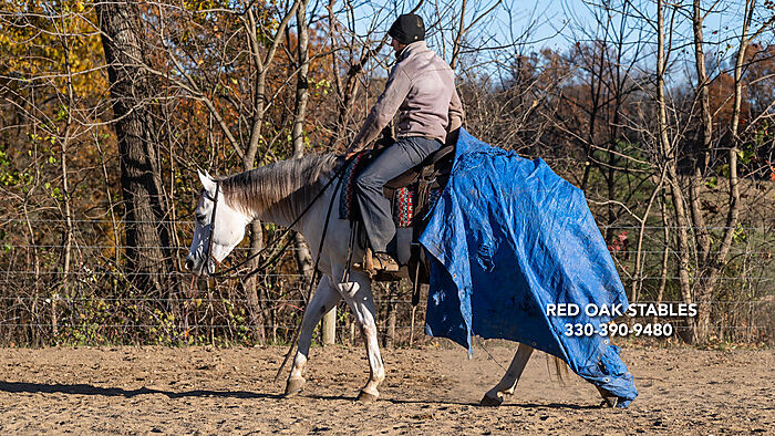 Pro has a nice deep stop and really likes to turn. We have started him on spins and sidepassing. Pro has also been ridden outside the arena as well and rides either alone or with other horses. He has been ridden on the road and does well in traffic.