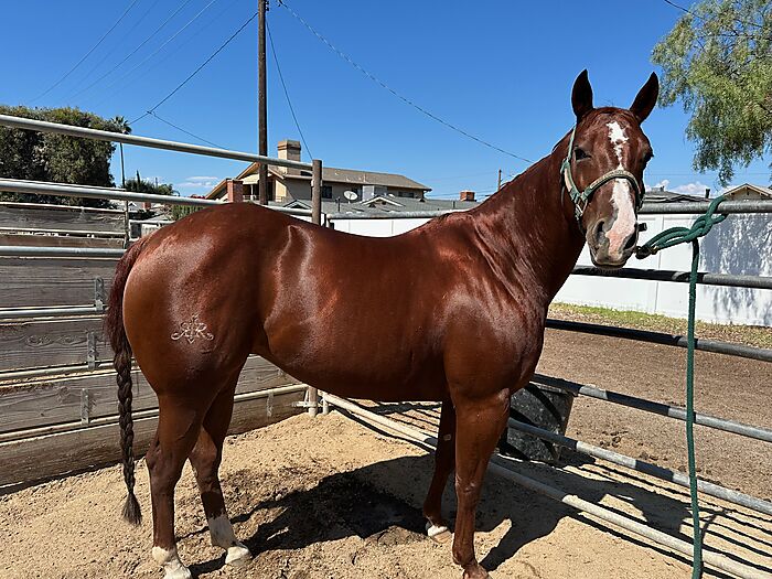 Flashy 6 y/o sorrel mare. This mare was previously trained by Justin White and is 5KNNP eligible in 2026. Lady took 3rd place in the 4 Year Old Intermediate Amateur finals at the PCCHA Holy Cow Performance Horses Futurity and Super Futurity in Las Vegas. She recently placed 3rd in the 50K 5/6 Amatuer Class at the Clements Cutting/Summer Bash in Paso Robles, CA. Lady is level headed, no bad habits, easy to get show ready, trailers nicely and goes out on trails. This mare has been ridden by my son and would easily cross over to other disciplines. She is current on all vaccines/worming and has no major health issues/excellent confirmation. This is an excellent opportunity for you to have a show ready amateur horse or youth horse come this new year or an excellent brood mare prospect.