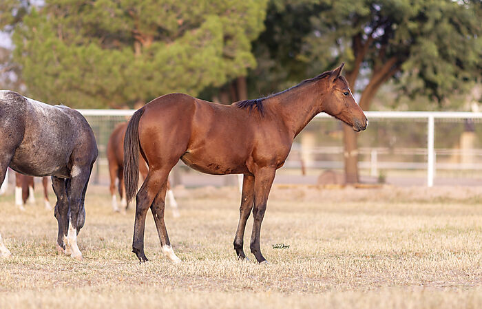 Flashy Bay Filly out of Reychel Cat (NCHA LTE $33,800) by the great Badboonarising. She's quick footed and athletic, wants to get her butt in the ground and scoot around. She's built like one should be.