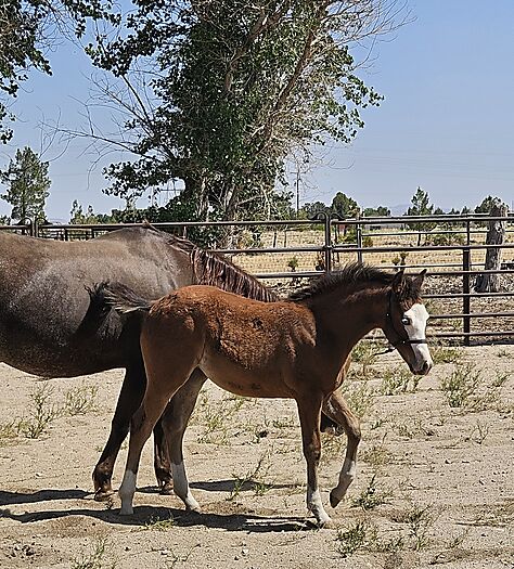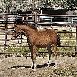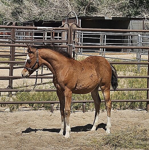 DROP DEAD GORGEOUS YEARLING GUNNER FILLY! This filly will stop you dead in your tracks! She is a Bay Splash with 4 White Socks and 2 Blue Eyes with black eyeliner. She is as fancy as the day is long and she knows it! Already showing the cow side of her pedigree and lopes around looking as smooth as can be. This filly is very correct in every way, she has a beautiful little face, big eyes and huge bone. Her dam is a NCHA $ producer and is sired by the king himself~High Brpw Cat. This is definitely a good one! Open to offers to show home.