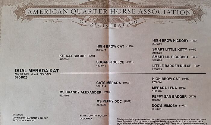He is sired by Kit Kat Sugar, the $14 million sire by the legendary High Brow Cat! Kit Kat Sugar has NCHA earnings of $240,903. He is an NCHA Super Stakes Reserve Champion and an NCHA Horse Of The Year. His foals have been successful in the cutting pen, reined cow horse, and roping pen. They are athletic, versatile, and great minded! This gelding has all of those attributes! His dam, Ms Brandy Alexander is sired by Cats Merada and won $2,980 in the NCHA. Cats Merada is an NCHA money earner of $177,900 and has sired earners over $7.9 million. "Ninja" has been used on the ranch, he is rope broke, started tracking the sled, he gathers and sorts pairs, he's been hauled to events, and is used daily in our program turning back and working alongside the cutting horses. He can go any direction, he's talented, trainable, and can work all day. He has a huge stop, he collects, neck reins, knows seat and leg cues, and has patience when you need it. He has the foundation to make an exceptional breakaway, calf, or heel horse! Sorters and penners, take a look! He's gritty, fast, and willing to do anything you ask!