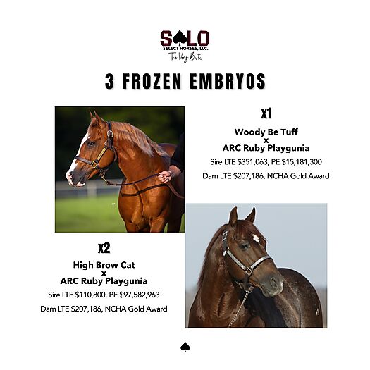 Two of the embryos are sired by High Brow Cat whose influence has shaped the modern western performance horse industry. He earned $110,784 during his career and is now a $97.5 MILLION SIRE. The third embryo is sired by Solo Select’s very own, Woody Be Tuff. “Woody” is the heart and soul of Solo Select and has sired so many champions including Wood She B Magic who won $385,803 and was the bronze CHAMPION at the NCHA OPEN Futurity. He is now a $15.1 MILLION SIRE!