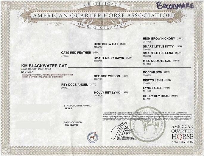 Now that we have your attention, let’s talk about her! 𝗞𝗠 𝗕𝗹𝗮𝗰𝗸𝘄𝗮𝘁𝗲𝗿 𝗖𝗮𝘁 is a 2008 AQHA black mare by Cats Red Feather (High Brow Cat x Smart Misty Dawn, by Smart Little Lena) out of Rey Docs Angel. She is confirmed in foal to 𝗗𝘂𝗮𝗹 𝗥𝗲𝘆𝗶𝘀𝗵 (LTE: $456,000+, PE: $1.6 million) and is 𝗲𝘅𝗽𝗲𝗰𝘁𝗲𝗱 𝘁𝗼 𝗳𝗼𝗮𝗹 𝗠𝗮𝗿𝗰𝗵 𝟮𝟱, 𝟮𝟬𝟮𝟲. With her being black and Dual Reyish’s ability to throw some chrome on his foals, this foal is shaping up to be a standout both genetically and visually. Add in her exceptional disposition, and you have a mare that is truly a pleasure to be around.