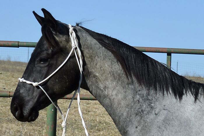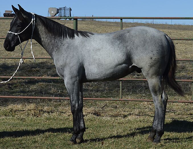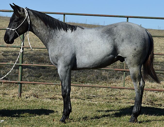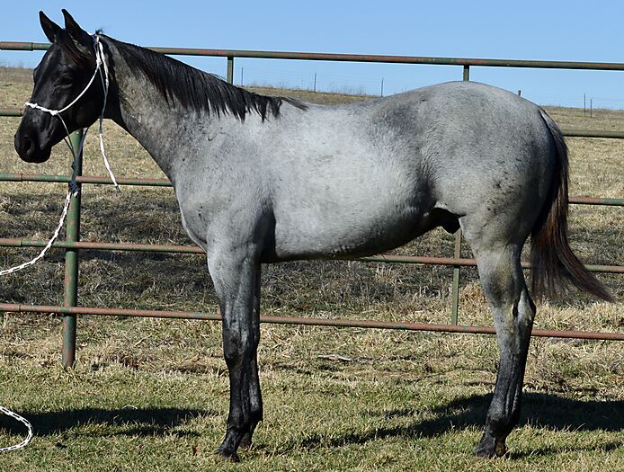 Razz is a gorgeous TRUE BLUE "own son" of the great Krogman Ranch stallion, Theolerazzledazzle. Black head. No white. Razz is as blue as blue gets! Super quiet and easy to get along with. Handled by a seven year old girl! Perfect head and ear. Top stallion prospect! Correct, sound, both down, straight in the mouth. The word "Kros" is on his face papers seven times! Ranch horse, Trail horse, Stallion prospect! If you want to raise top quality Ranch horses or if you want the prettiest mount going down the trail, here is your opportunity! Delivery available.PorterQuarterHorses com