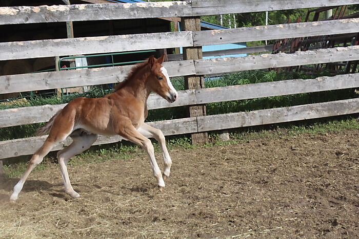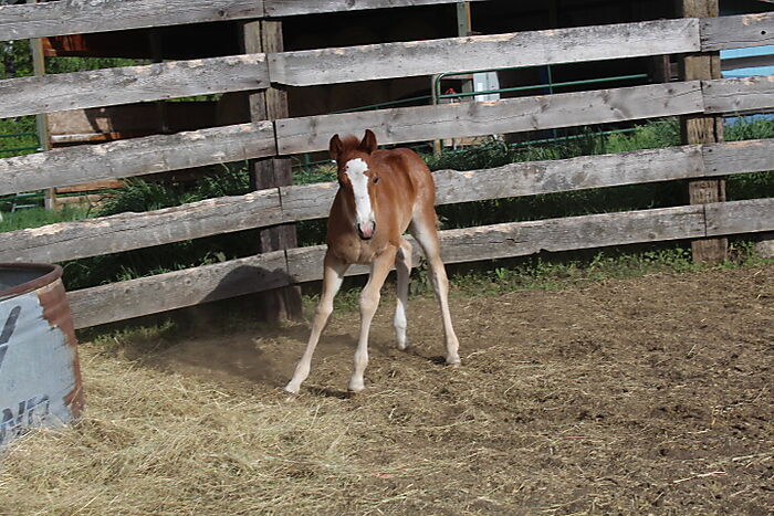 Cats Outa The Bag, 2021 sorrel rabicano colt. By Smooth As A Cat, out of a Daughter of Mecom Blue, grandaughter of Smart Little Lena. This colt is very athletic, great mind, easy to work with. Has great potential.