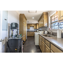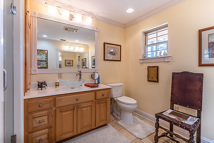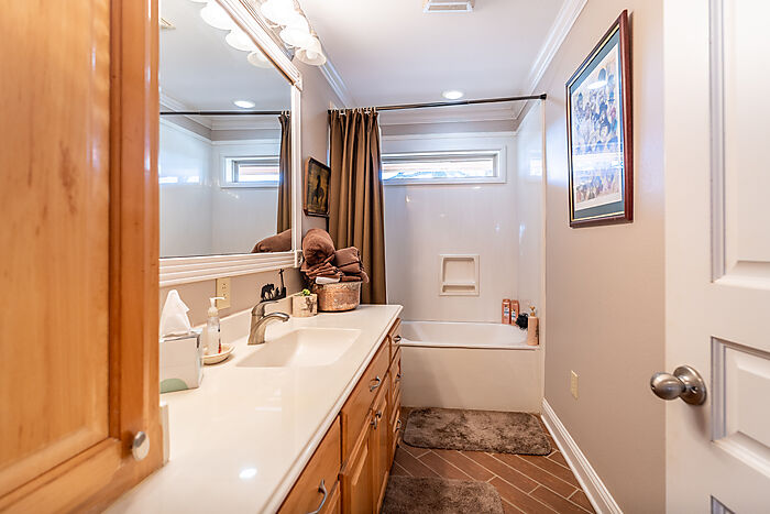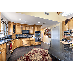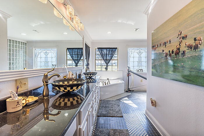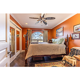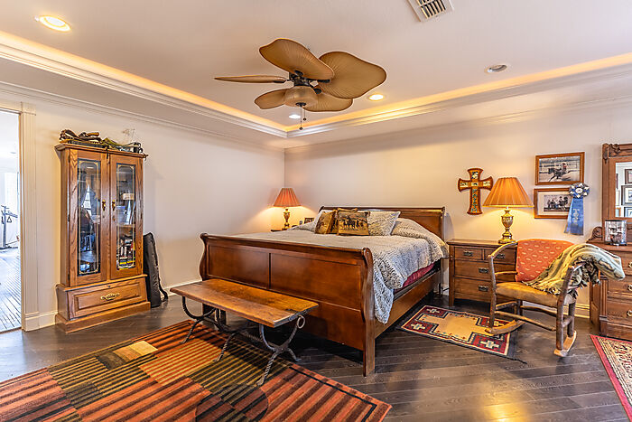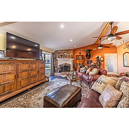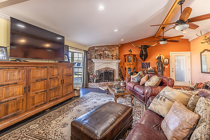 The spacious interior features a thoughtfully designed 3BR-4BA, highlighted by an open-concept floor plan, vaulted ceilings, exposed wooden beams, and a welcoming wood-burning fireplace. The kitchen is both functional and elegant, equipped with granite countertops, a double drawer dishwasher, a double oven, and a convenient pot filler above the gas range. A large pantry provides ample storage, while the center island offers an inviting space for meal preparation The main suite is a standout feature, offering an oversized walk-in closet and a luxurious bathroom with a jetted tub and separate shower. The three-car garage includes a hobby area and an additional full bath for added convenience.
