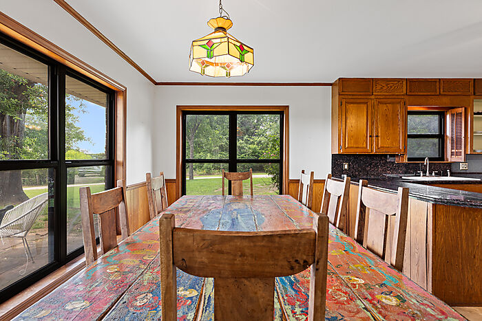 From the back porch, you overlook 11 pipe-and-no-climb fenced turnouts that provide safe, sandy footing—perfect for turnout, exercise, and grazing. The serene landscape features mature native trees and nearly 80’ of rolling elevation change. A private pond adds to the natural beauty—and the peacefulness of this incredible ranch.