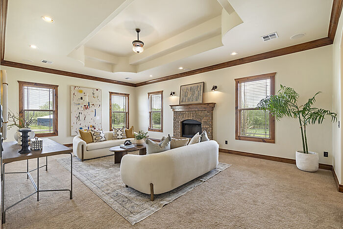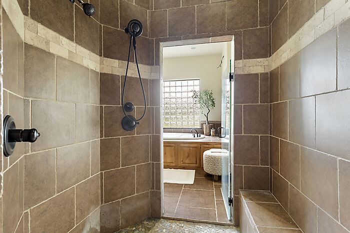 The primary suite is its own private retreat with his and her vanities, a jetted soaking tub with fireplace, pass-through shower, and a massive walk-in closet. Even the family dog has its own custom pet shower in the garage!