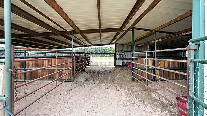 Beyond the residence, the property shines with 10+ acres of improved coastal pastures, newly cross-fenced with pipe top rail and high-tensile no-climb wire into 6 paddocks, each equipped with automatic waterers. The equestrian facilities are thoughtfully designed for both function and comfort: