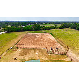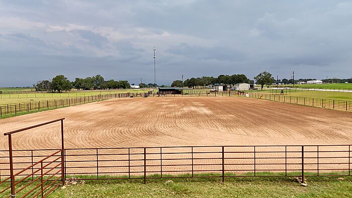 Brand-new 155' x 260' pipe Roping/Riding Arena with excellent footing, adjustable boxes, and a Priefert solar chute