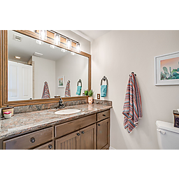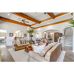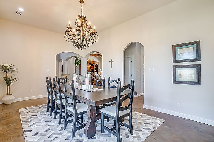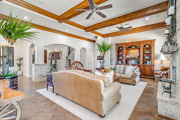 Inside, the home is equally impressive. Guests are welcomed into a grand Great Room with soaring 12-foot ceilings accented by rustic beams and anchored by a striking stone fireplace. The formal dining room comfortably hosts 10 guests and opens through French doors onto the covered front porch for evening relaxation, or quiet mornings in rocking chairs.