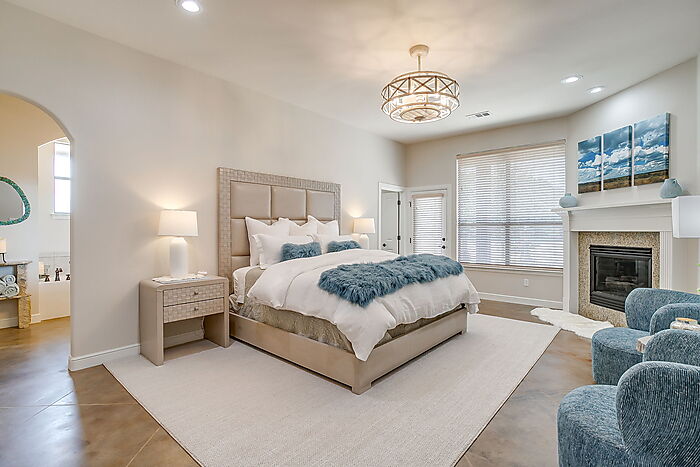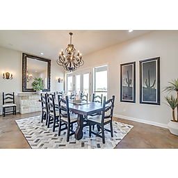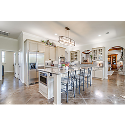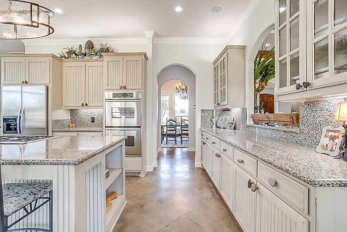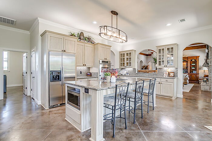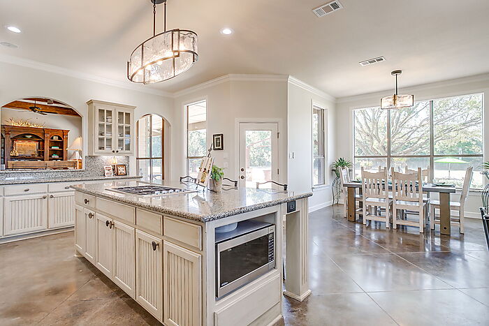 The gourmet kitchen is designed for gathering, cooking, and entertaining. It features a spacious granite island with bar seating, a gas cooktop, custom cabinetry, and a dining nook framed by windows overlooking the outdoor living area. Step outside to enjoy the expansive covered patio, complete with a gas fireplace and wood-burning pizza oven, ideal for family nights or hosting unforgettable parties under the Texas stars.