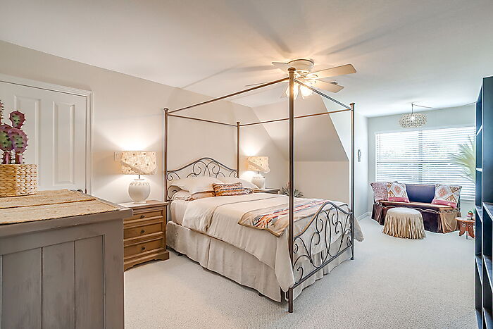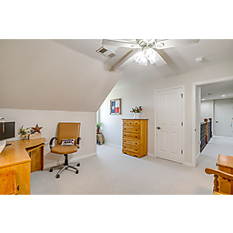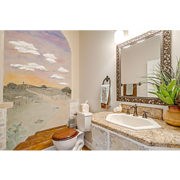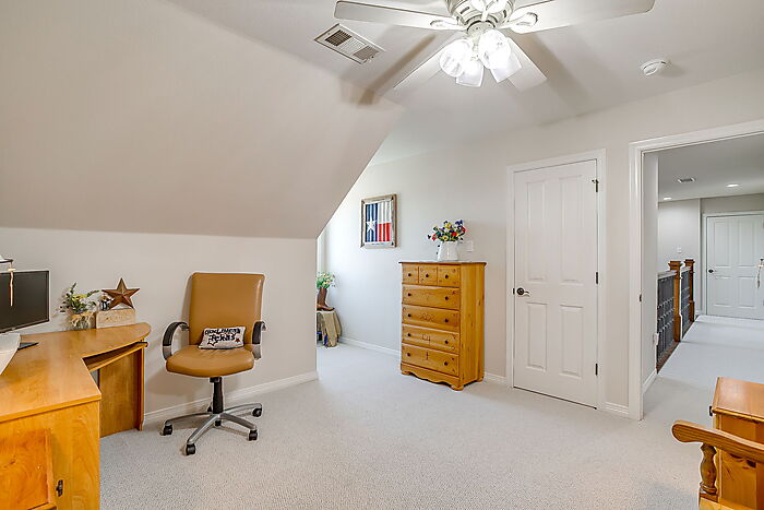 On the private wing of the home, the luxurious master suite offers a peaceful escape with its own fireplace, a generous bathroom, walk-in closets, and a dedicated office with large windows bringing in natural light and serene views. A second en-suite bedroom, currently used as a media viewing room, can easily adapt into an additional office, gym, or guest suite with French doors opening to the patio. Upstairs, three more bedrooms provide flexible living, two with their own en-suite baths. These rooms can serve as guest quarters, children’s rooms, additional offices, or playrooms. Every window frames views of the property’s beauty, from rolling pastures in the front to wooded acreage in the back.