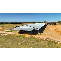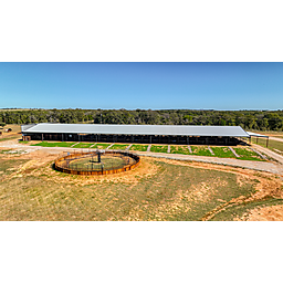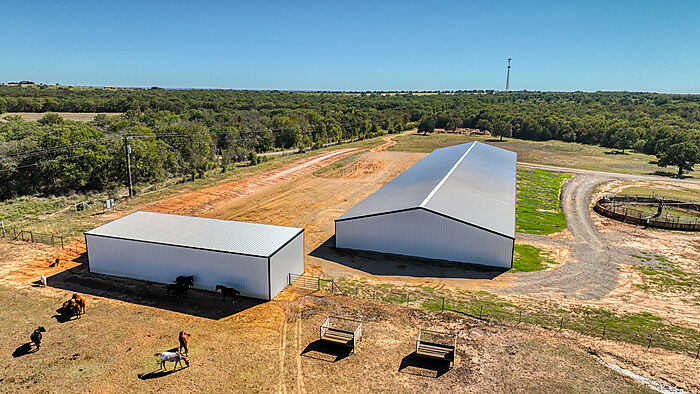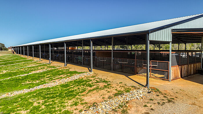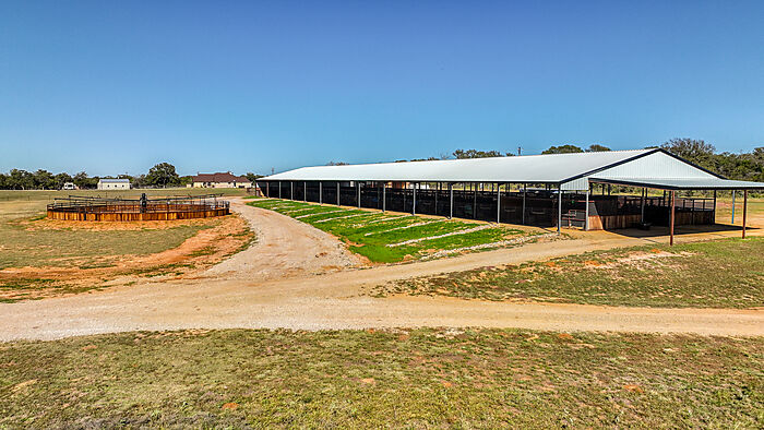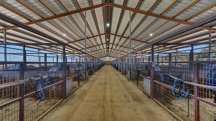 Constructed in 2024, the main barn offers a 3-horse wash bay, LED lighting throughout, and a beautifully finished programmable 6-horse Priefert panel walker. A dedicated 30’x80’ equipment storage barn provides ample space for trailers, tractors, and operational equipment. The second barn includes 10 additional stalls with a concrete alley, wash bay, and six covered runs, making it ideal for show horses, mares, or yearlings, with convenient access to the roping arena and cattle pens.