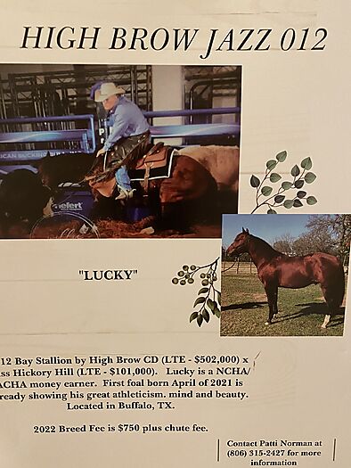 2012 Bay stallion by High Brow CD (LTE -$502k) x Miss Hickory Hill (LTE - $101k). LTE - $13k, trained and shown by Brady Ripple. First foal born in 2021 and 2022 colts show his great athleticism, mind and beauty. If interested, please contact Patti Norman at 806-315-2427 or email pattinorman52@yahoo.com