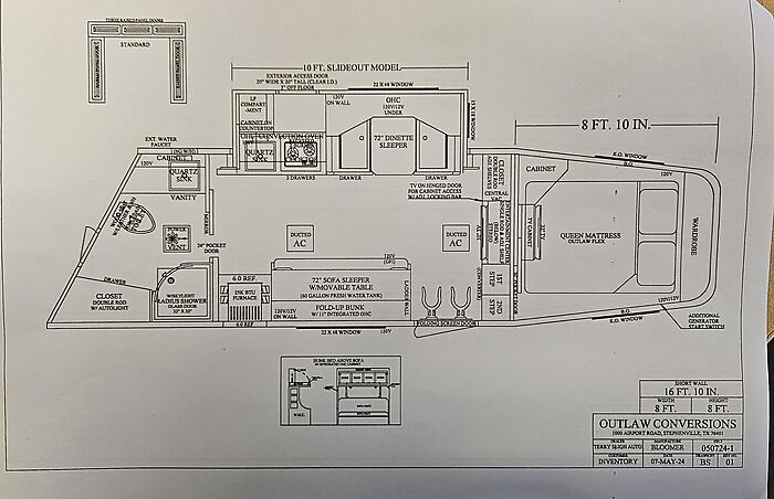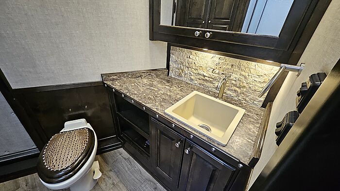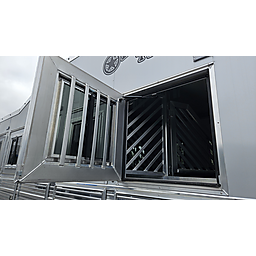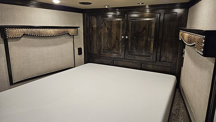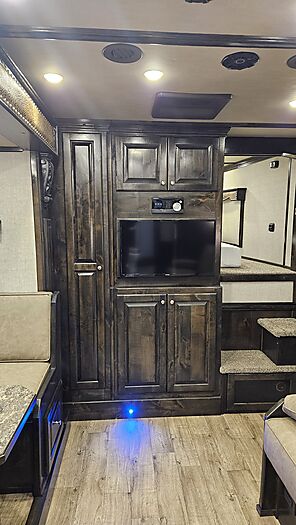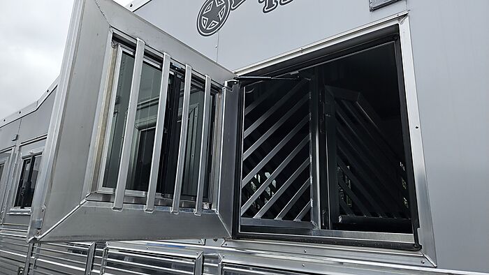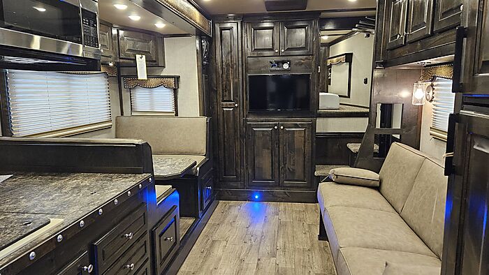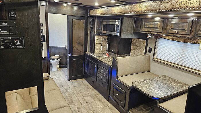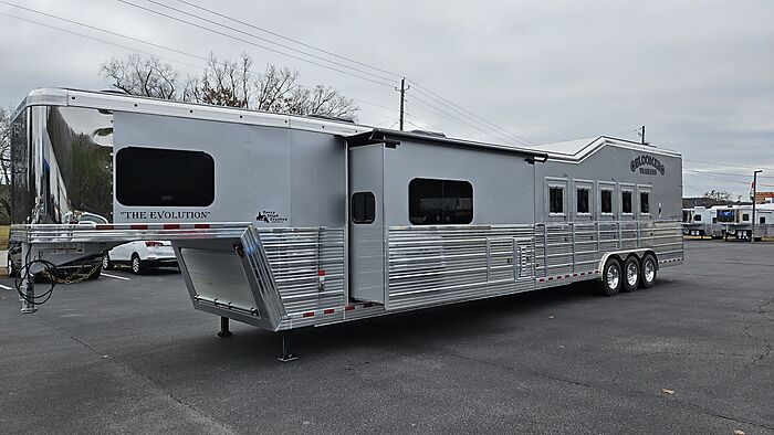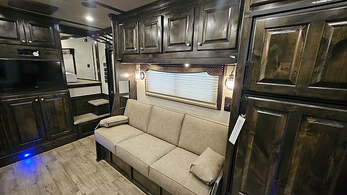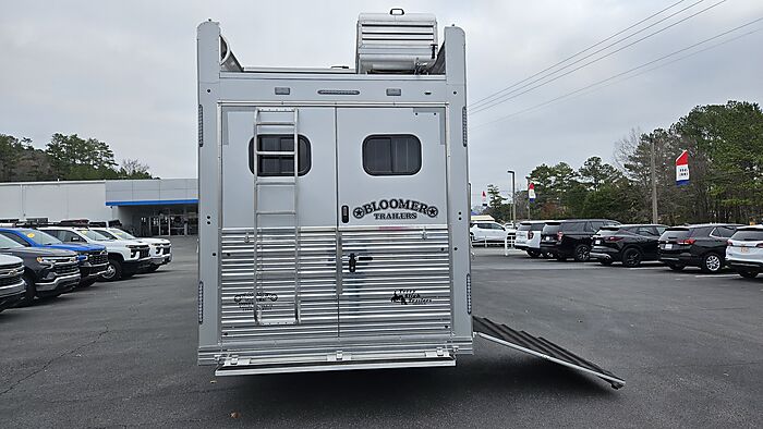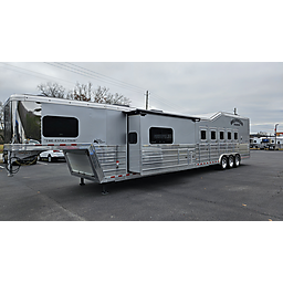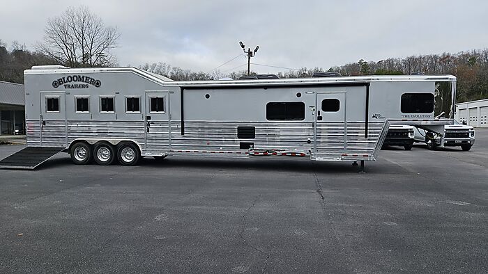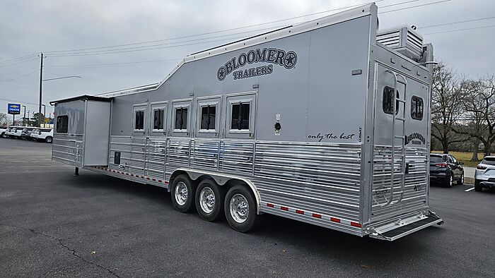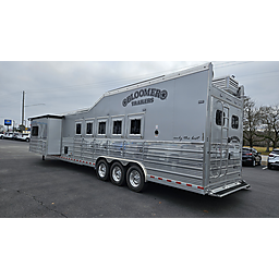 Brand new 2025 Bloomer 5 Horse LQ PC Load with Outlaw Conversion, It has 3 8,000lb axles, 19.5in Alcoa Wheels, Enclosed front end, Hydraulic jacks, Electric over hydraulic brakes, Mangers, drop doors on head and tail with shocks on feed doors, stud wall, huge rear tack with 110 outlet, 1 10ft slide includes 72in sleeper dinette with kitchen, kitchen has separate LP bottle, bread box, integrated hay pod, gas generator, escape doors on both sides, 2 A/Cs, central vac system, 2 TVs, sleeper sofa with over head fold down bunk, Rock veneer accents in the both sink areas, cook top and microwave, spacious bathroom with large closet and pass thru door, 16.9ft short wall, 60gal fresh water tank under couch, Call