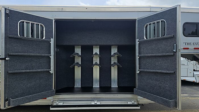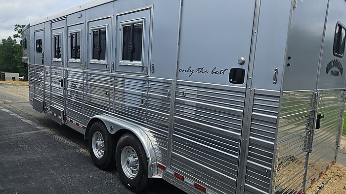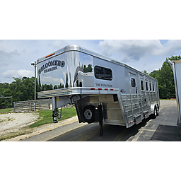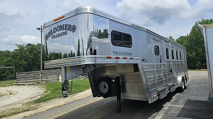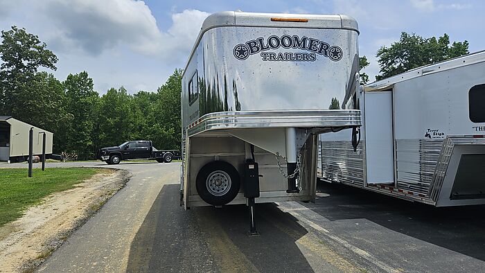 Barely used 2018 Bloomer 4 horse trainer trailer, huge double door side tack, rear broom closet, ramp, drop doors on head and tail, mangers, stud wall, ELECTRIC BRAKES, 16in alcoa wheels, dressing room with boot box, escape door.