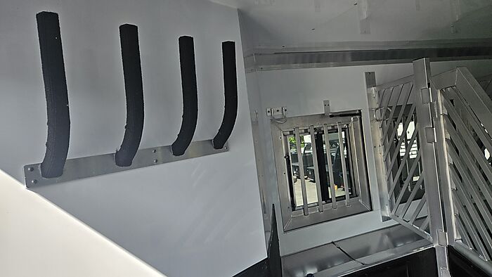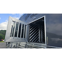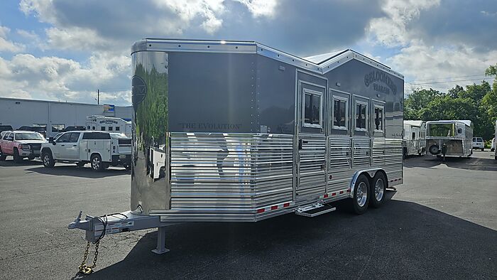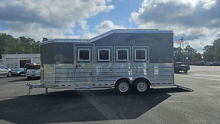Brand new 2025 Bloomer 4 horse bumper pull, has drop doors on head/tail and shocks on feed doors, managers, stud wall, escape door, 2 8,000lb axles with 19.5in Alcoa wheels, electric over hydralic brakes, hydraulic jack, ramp, saddle rack in rear tack can be moved to front dressing room, integrated hay pod.