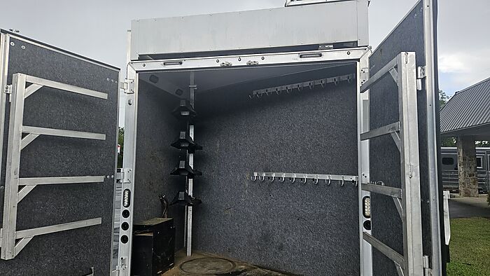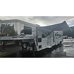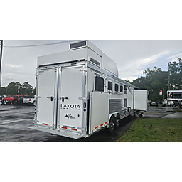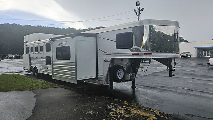 2023 Lakota Charger 4 horse, PC Load with bunk beds! 15.8ft sw, drop doors on head and tail, mangers, hay pod, generator on top, 17.5 wheels and tires, electric brakes, dual hydraulic jacks on front, dinette in slide, big bathroom, stove and microwave, bunk beds in the rear behind bath.