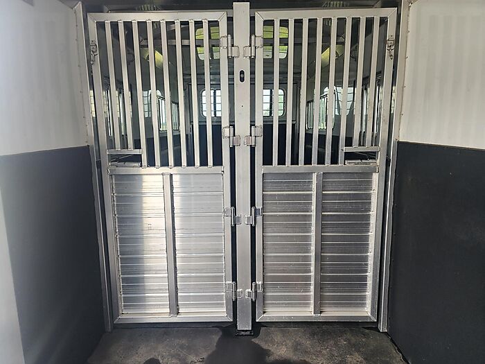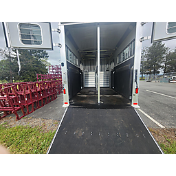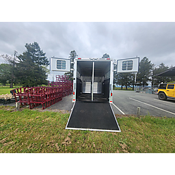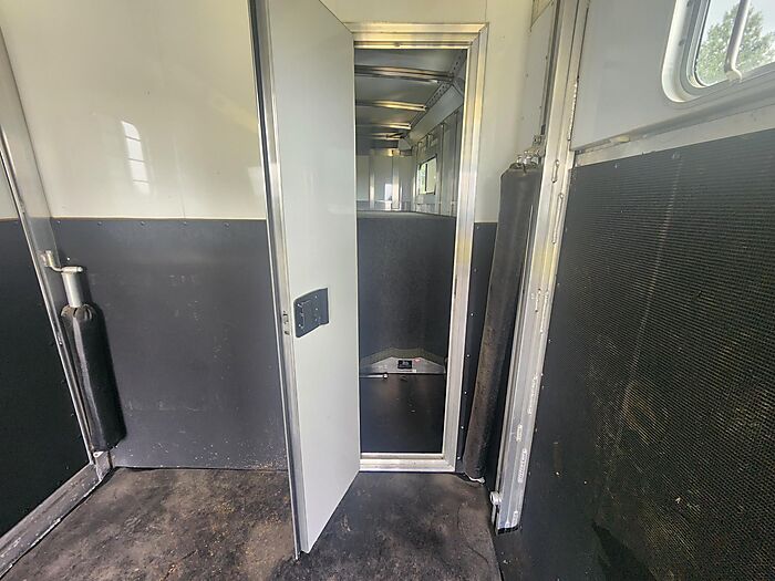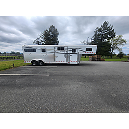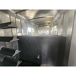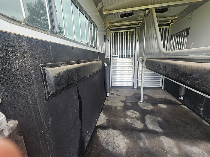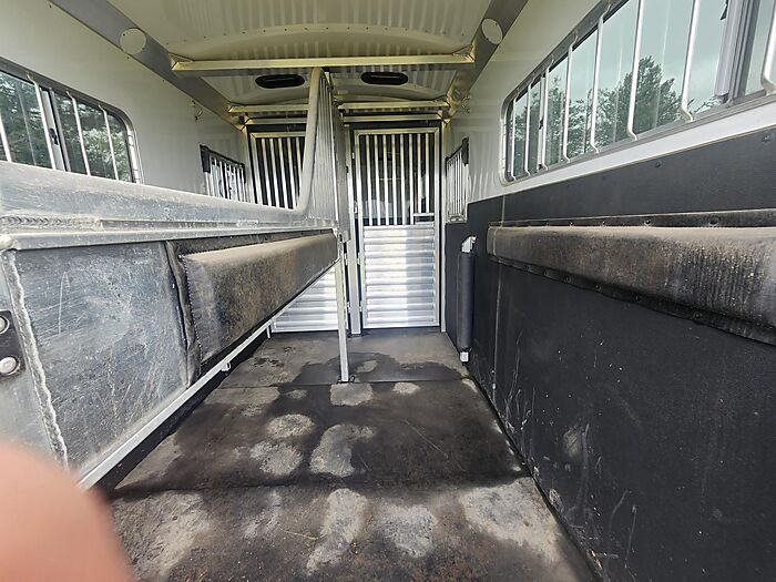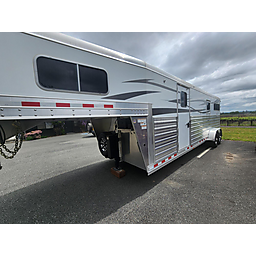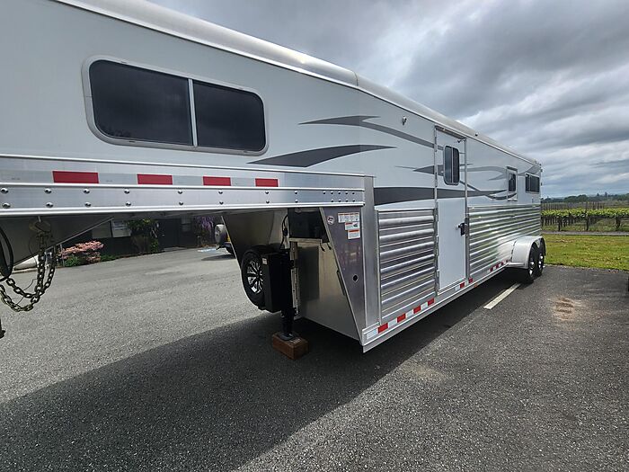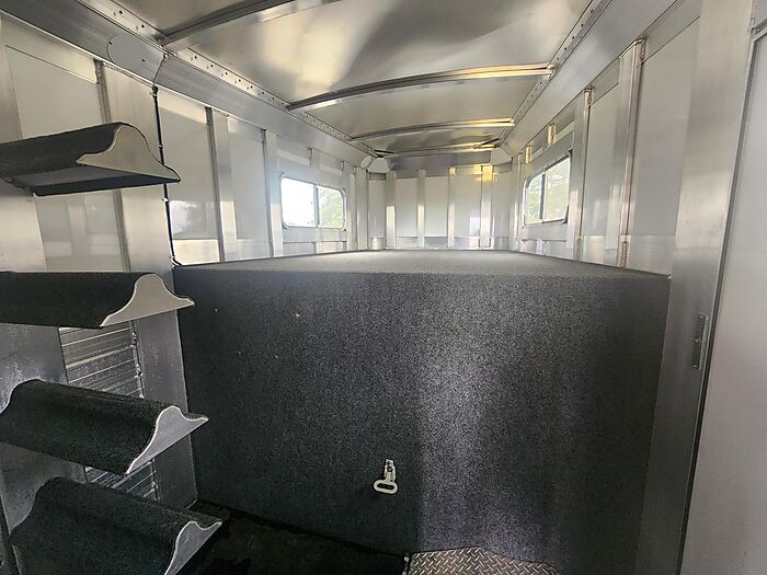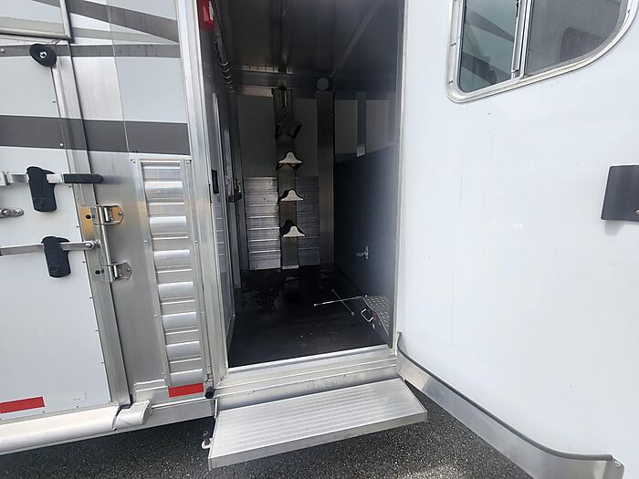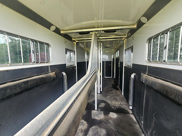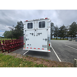 Used 2020 4 Star 2+1 Warmblood sized gooseneck trailer-24'6" x 7'6" tall-Extra large plus one compartment 114". Extra long stalls and manager area 84" + 42"-stow away bar at side ramp. 7000# axels-Lined and insulated horse compartment roof-EZ lift side and rear ramps, both 60" tall, quiet ride divider. Loading lights, interior lights, full height stud doors with drop windows, roof vents in plus one compartment and over straight load stalls. Walk through door in bulkhead, fold down step at dressing room door. 2 saddle racks on removable post, brush tray, bridle hooks, blanket bar, rubber floor mats throughout trailer.