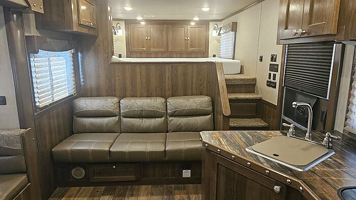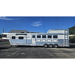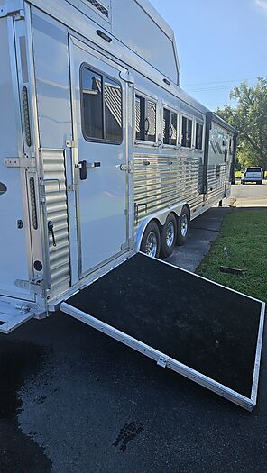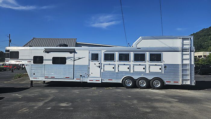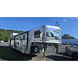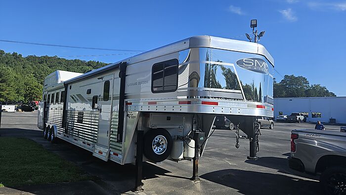 Like New 2020 SMC Laramie Edition 5 horse LQ, PC load w full rear tack, drop doors on head and tail, Werm Flooring, 14ft sw with 7ft slide out, 16in aluminium wheels, Electric brakes, pass thru door, escape door, stud wall, integrated hay pod, onan generator with only 23hrs, couch on drop wall, dinette in slide