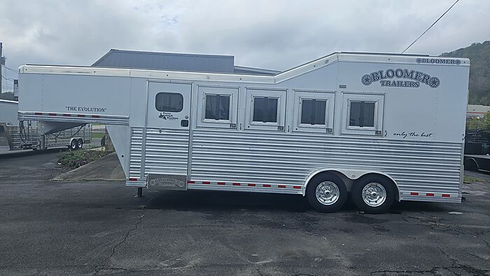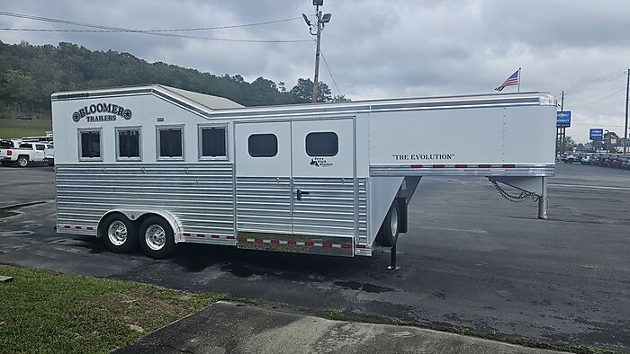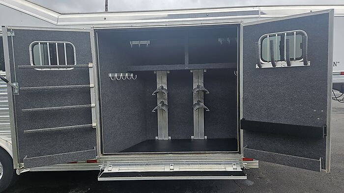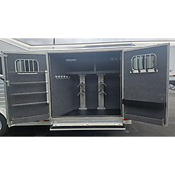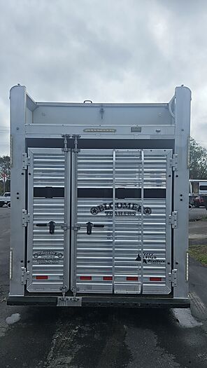 2021 Bloomer 4 Horse/Stock Combo trailer, has drop doors on head and tail, huge double door side tack, stud wall, brand new 17.5in tires on Alcoa wheels, front dressing room, Integrated hay pod, Werm flooring in horse area, electric jack on front, electric brakes.