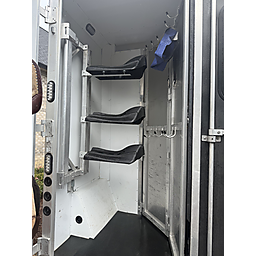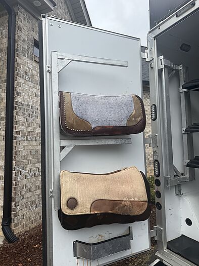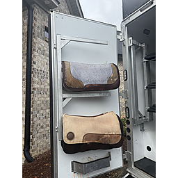 -Spacious rear side tack with swing out saddle racks. Brush trays on rear tack door. Hooks for headstalls.